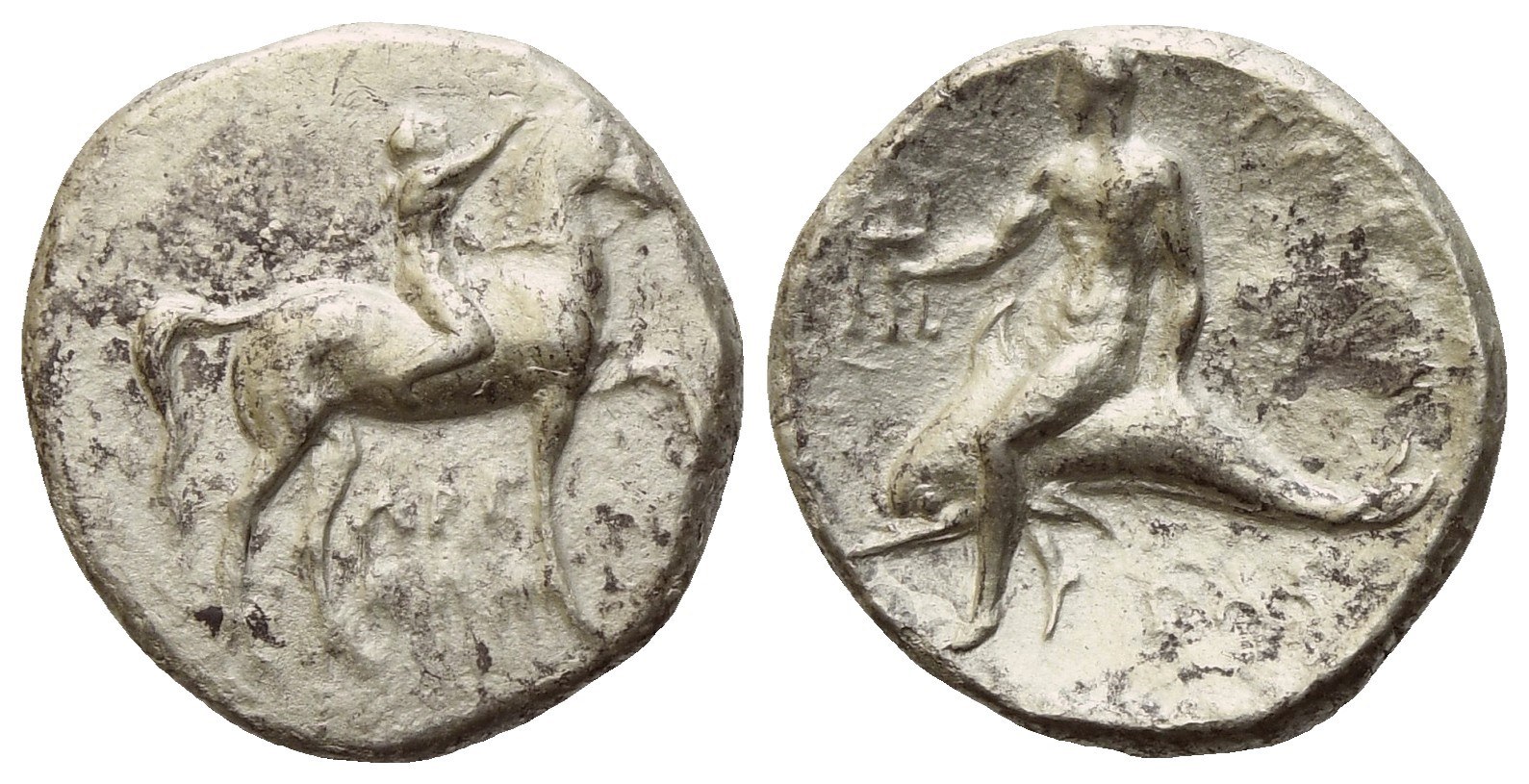 Arethon, Sa-, and Cas-, magistrates. Nude youth riding horse walking to r., raising his r. hand to crown the horse's head; ΣA to l.; APEΘΩN in two lines below; Rv. Youthful oikist, nude, riding dolphin to l., holding tripod in his r. hand and resting his l. on the dolphin; TAPAΣ to r.; below, KAΣ. HN Italy 957; Vlasto 666. VF