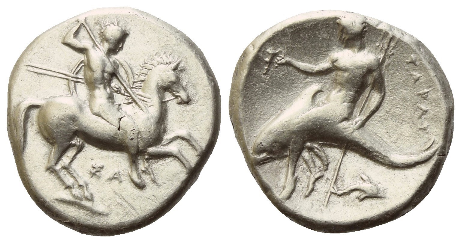 Sa..., magistrate. Nude rider on horse galloping to r., stabbing with spear held in his r. hand and holding two other spears and shield in his l.; below, ΣA; Rv. ΤΑΡΑΣ Youthful oikist, nude, riding dolphin to l., holding kantharos in his r. hand and trident in his l.; below, small dolphin to r. Fischer-Bossert 834 (V332/R646). HN Italy 937. Vlasto 624. VF