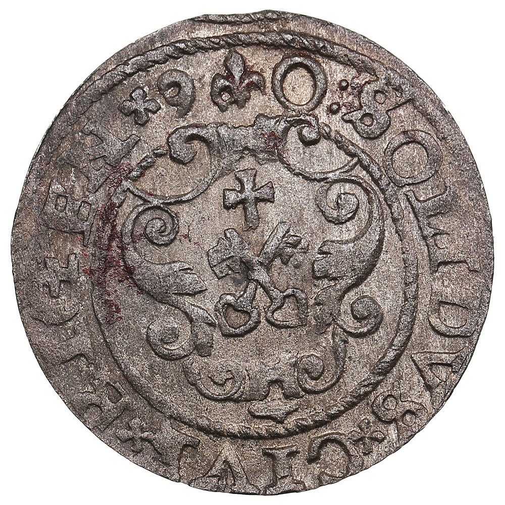 Rev.: Coat of arms of Riga in ornamented shield, lily above; “:SOLIDVS×CIVI×RIGEN×9-0”.
