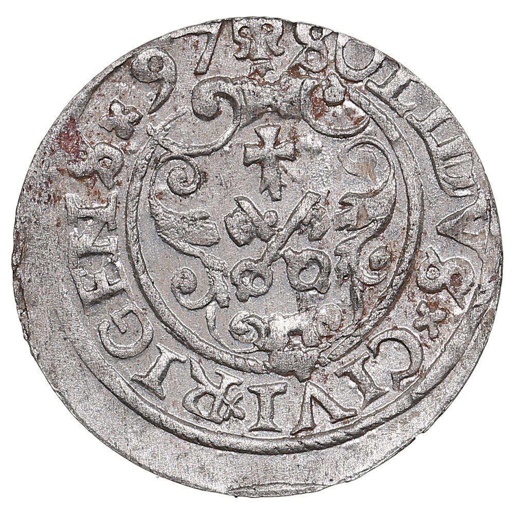Rev.: Coat of arms of Riga in ornamented shield, lily above; “SOLIDVS×CIVI×RIGENS×97”.