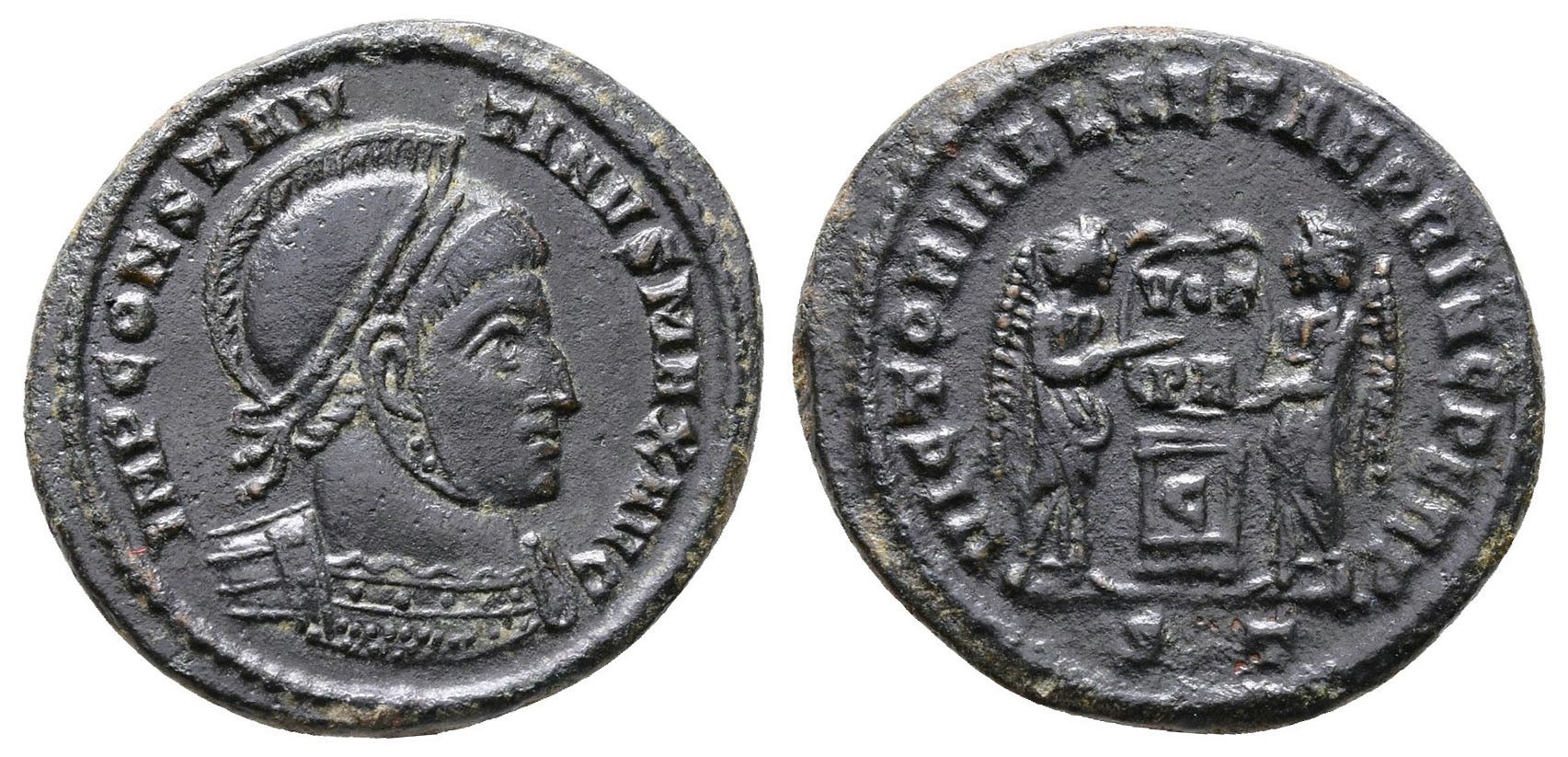 IMP CONSTANTINVS MAX AVG Laureate, helmeted and cuirassed bust r.; Rv. VICTORIAE LAETAE PRINC PERP Two Victories standing vis à vis, together holding shield inscribed VOT/PR in two lines on altar; cross//ST. RIC VII 90. Good very fine.