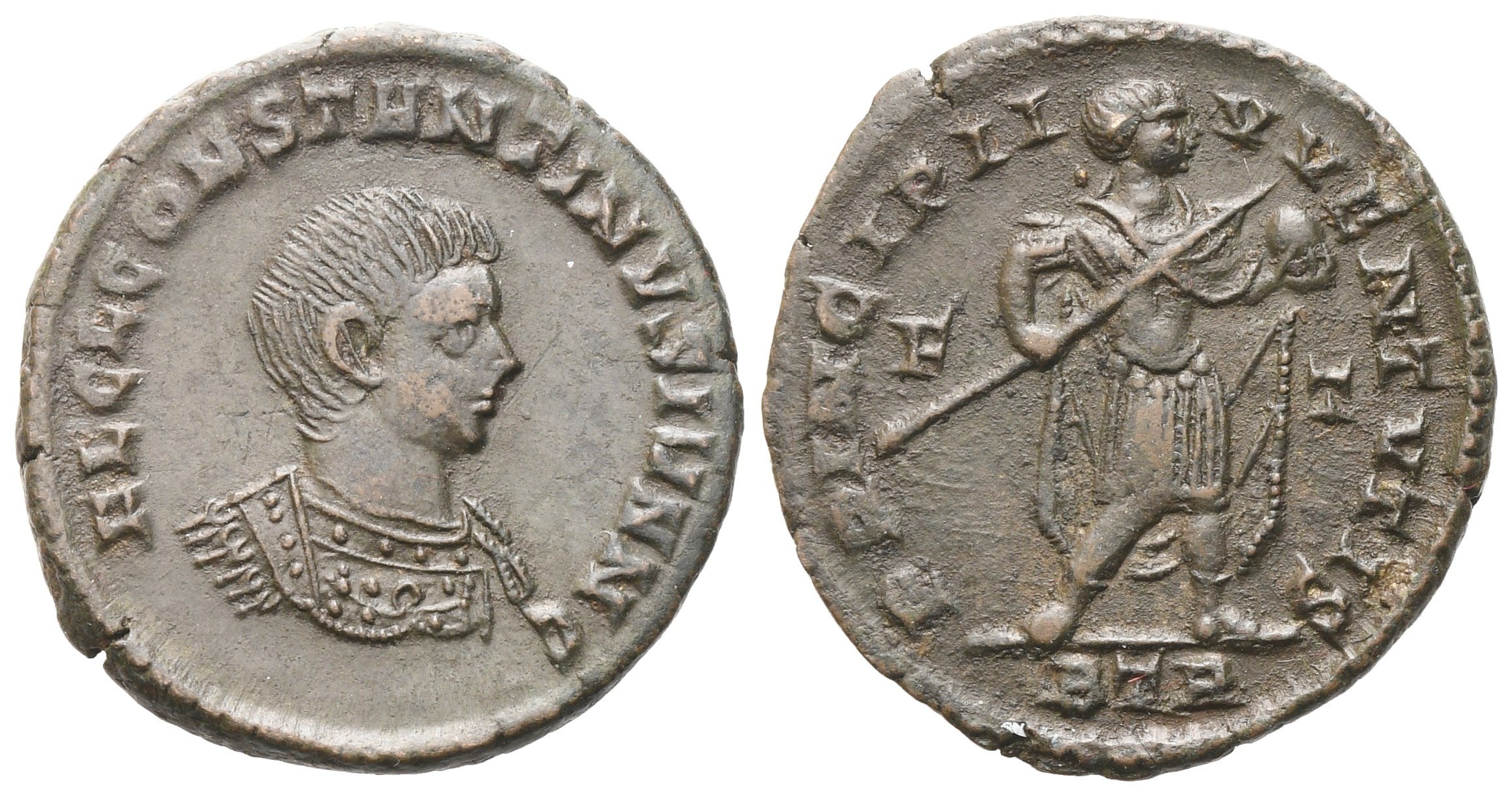 FL CL CONSTANTINVS IVN N C Bare-headed and cuirassed bust to r.; Rv. PRINCIPI IVVENTVTIS, Prince standing to r., holding transverse spear and globe; F – T across fields, BTR in exergue. RIC VII 174. About extremely fine.
