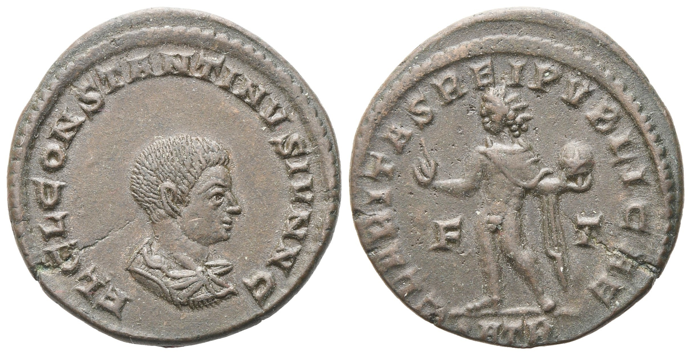 FL CL CONSTANTINVS IVN N C Bare-headed, draped and cuirassed bust r.; Rv. CLARITAS REIPVBLICAE Sol standing l., holding globe, raising hand; T – F across fields; BTR in exergue. RIC 125. gVF