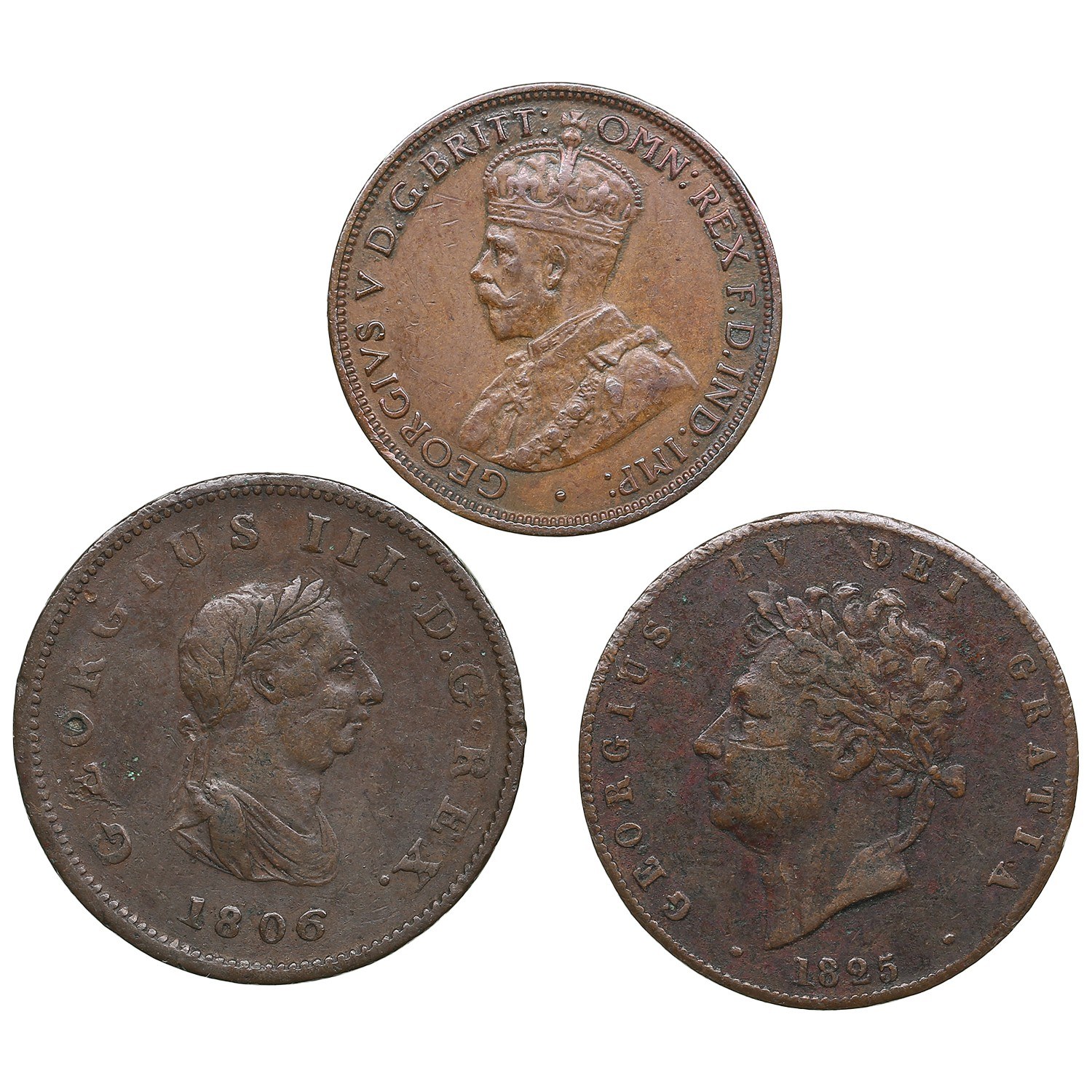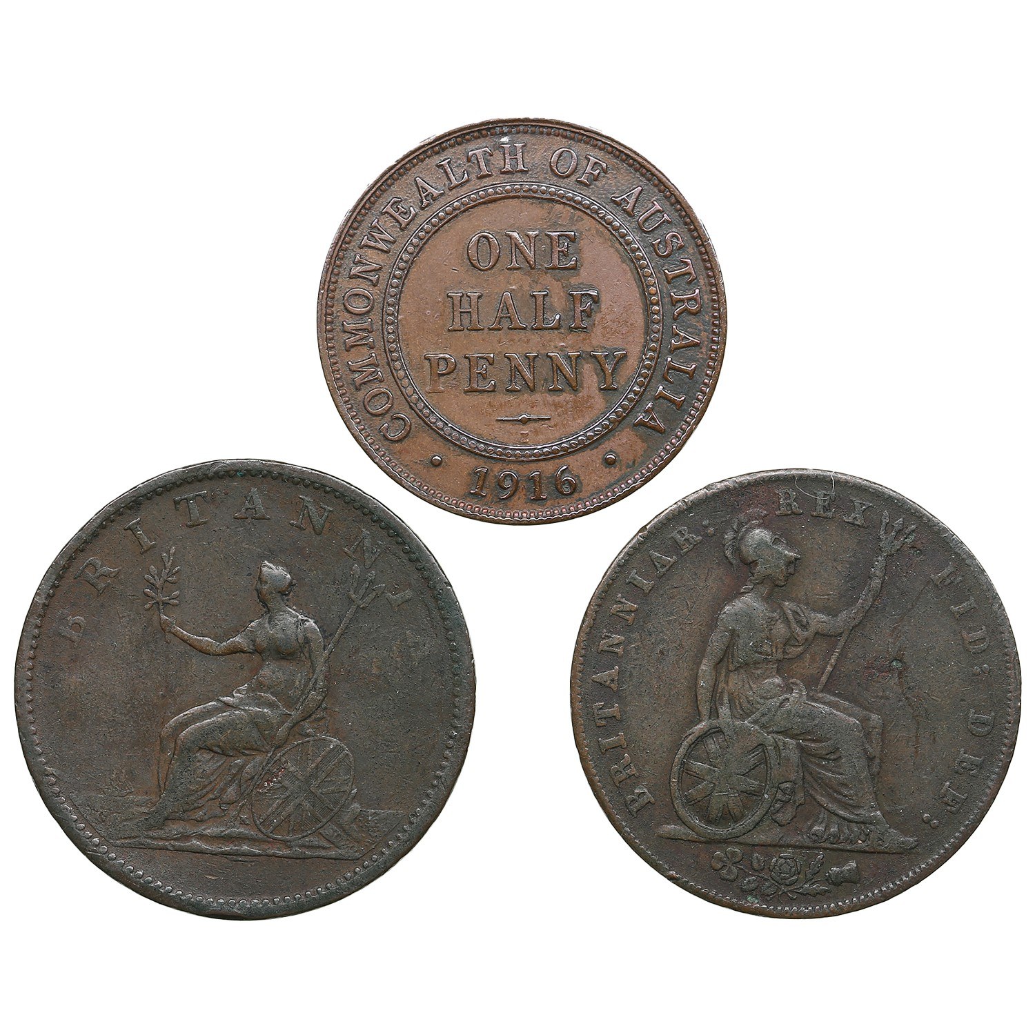 Various condition. Great Britain Halfpenny 1806 - George III (1760-1820). KM 662. Great Britain Halfpenny 1825 - George IV (1820-1830). KM 692. Australia Halfpenny 1916 - George V (1910-1936). KM 22.