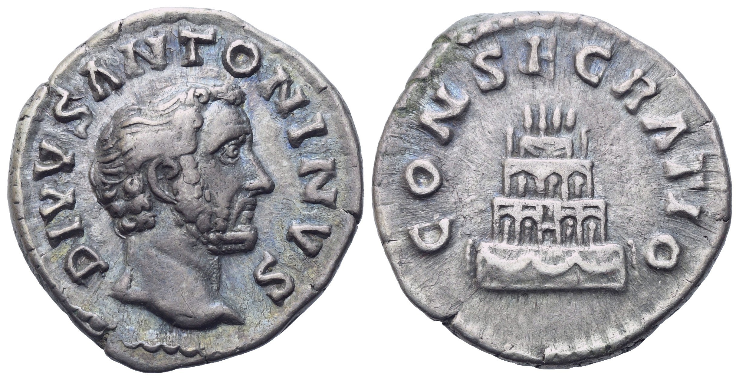 DIVVS ANTONINVS Bare head r.; Rv. CONSECRATIO Funeral pyre of four tiers surmounted by facing quadriga. RIC 436; RSC 164. Nice iridescence. Good very fine.