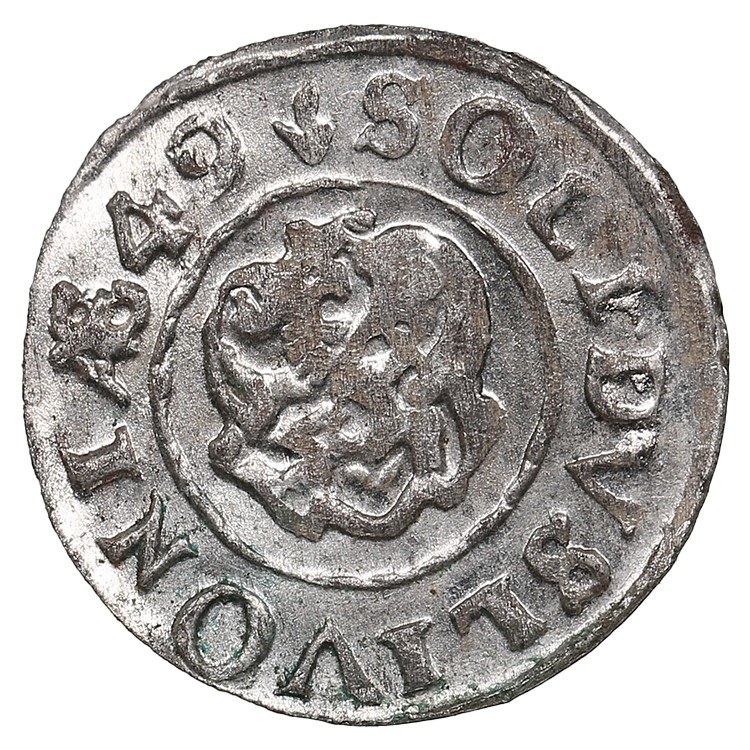 Rev.: Livonian griffin to left, in ornamented shield; “SOLIDVS LIVONIÆ 49”.