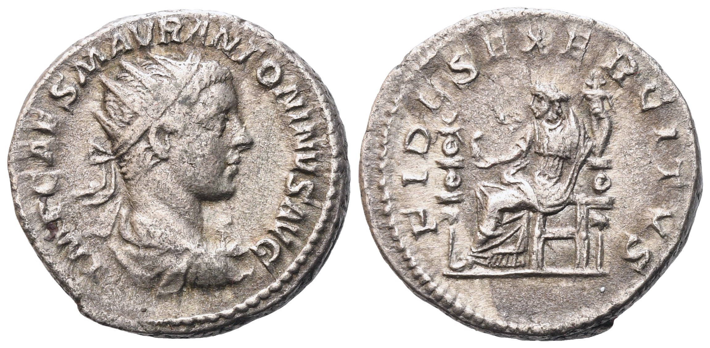 IMP CAES M AVR ANTONINVS AVG Radiate and draped bust to r.; Rv. FIDES EXERCITVS Fides seated to l., holding eagle and standard; before her, another standard. RIC IV 70; BMCRE 12; RSC 31a. gVF