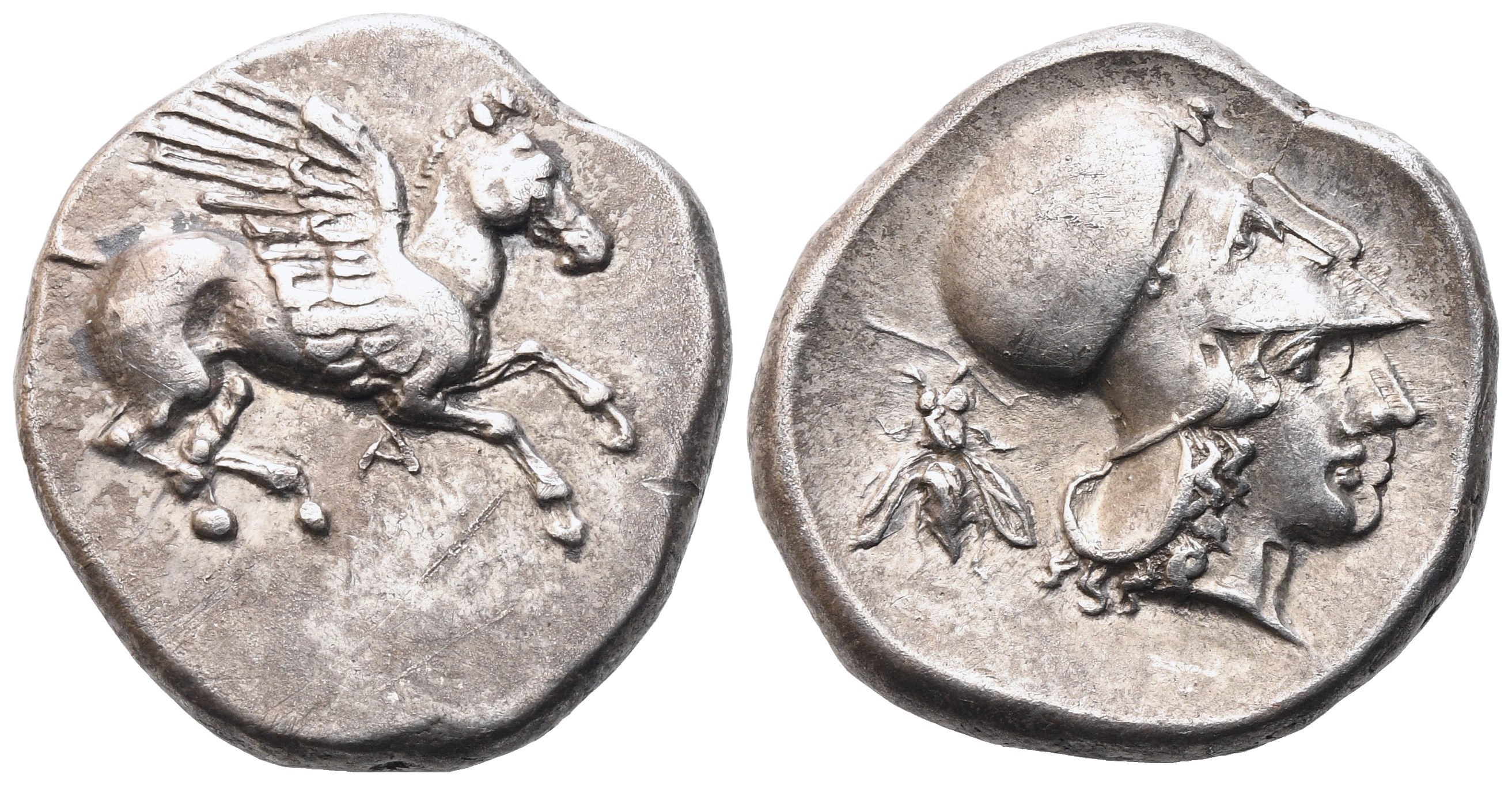 Pegasos flying to r.; A below; Rv. Head of Athena to r., wearing Corinthian helmet; bee to l. HGC 3.1, 201. Pegasi 40; Ravel 72. Slightly double-struck. About extremely fine.