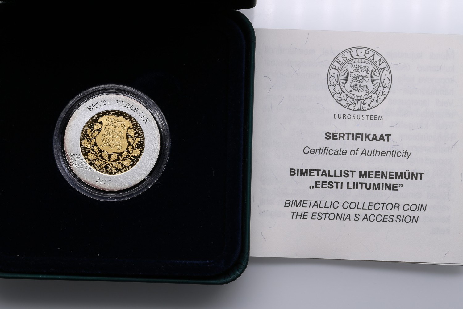 Box and Certificate. Certification number 06324. 14.6g. Au999,9; Ag 999,9. PROOF. Bimetallic: gold center in silver ring. Commemorative coin: Estonia's entry into Eurozone. KM 69.