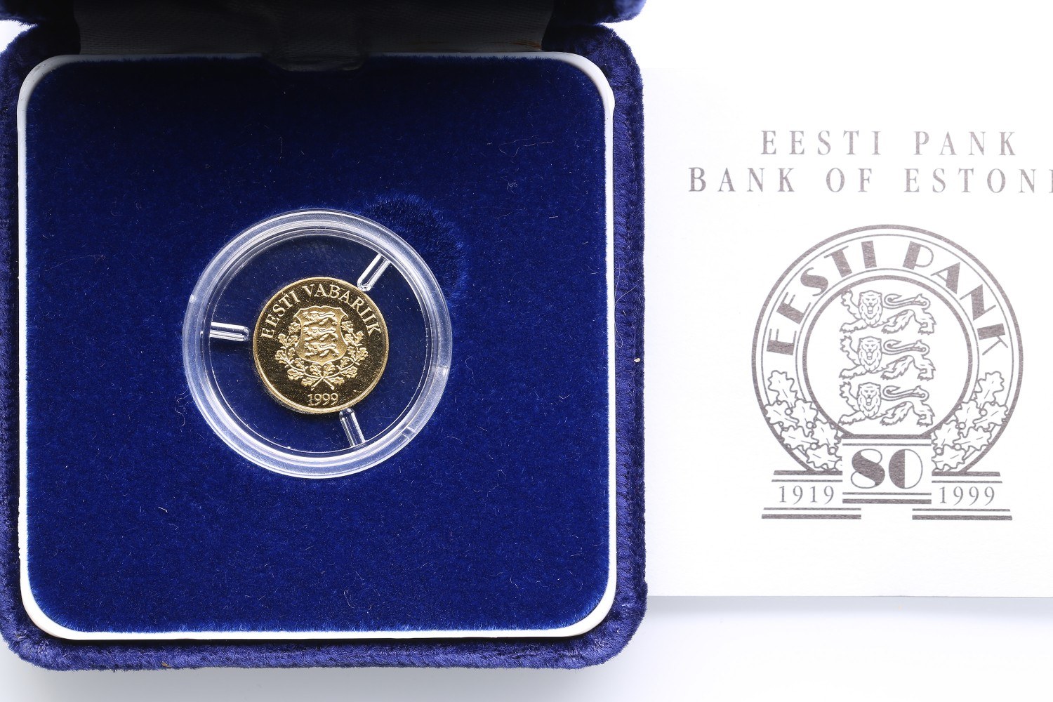 Box and Certificate. Certification number 1152. Gold 1.73g. Au900. PROOF. Commemorative coin: in celebration of the 80th anniversary of Eesti Pank, and introduction of the Euro. KM 37.