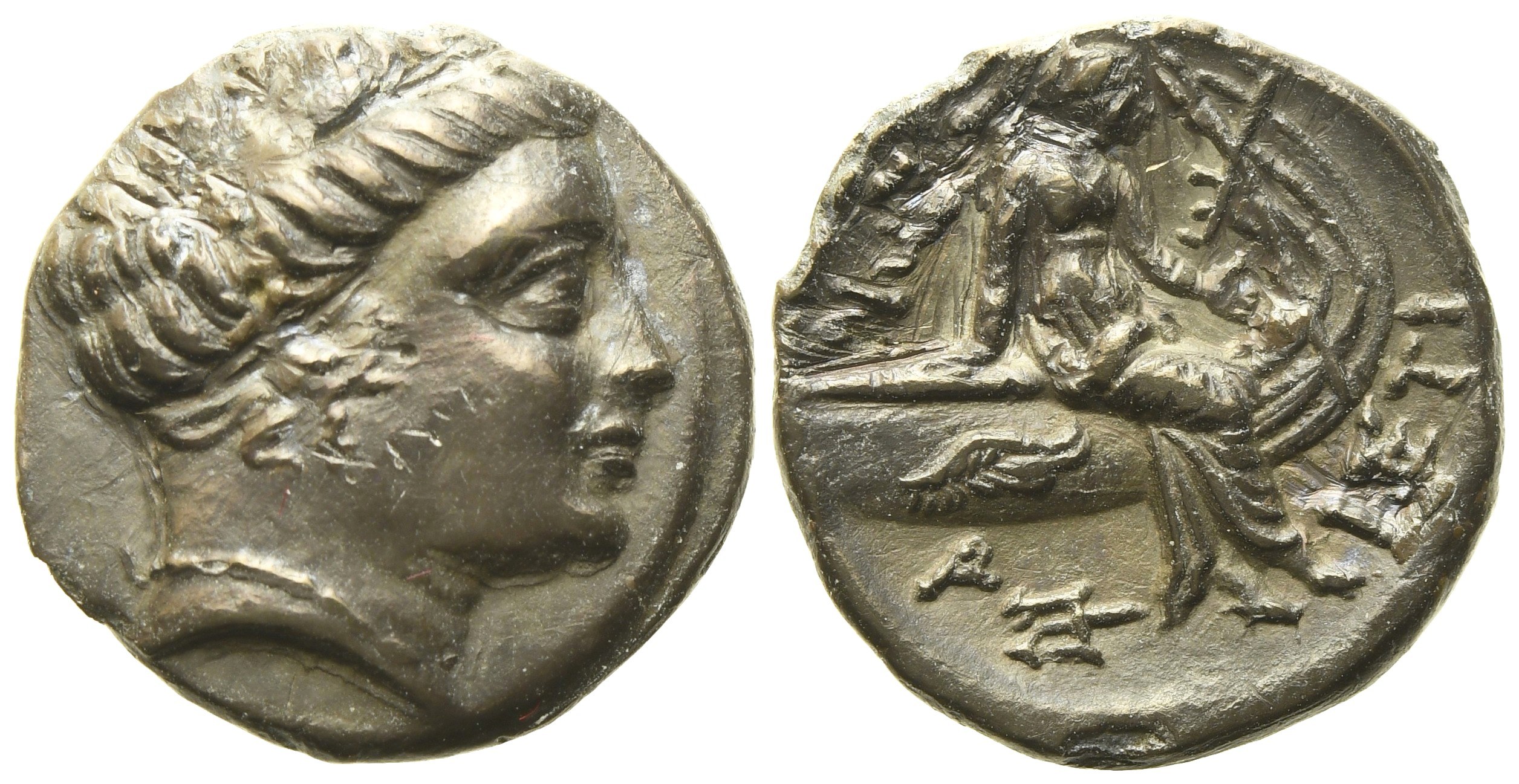 Wreathed head of the nymph Histiaia r.; Rv. Nymph seated r. on stern of galley; wing on side of galley, uncertain symbol/letter and trident below. BCD Euboia 380 ff. Dark patina. Good extremely fine.