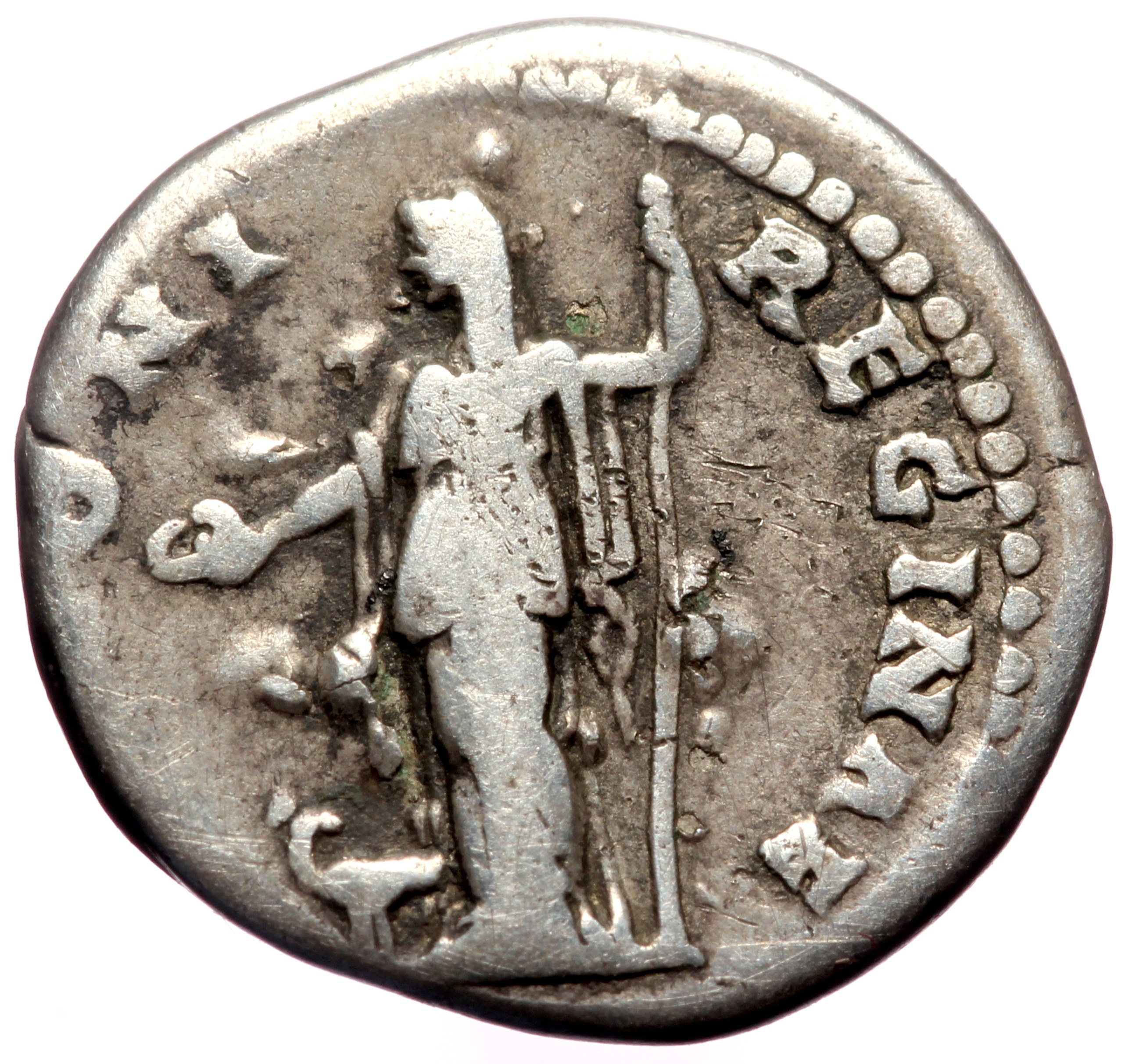 Rev: IVNONI REGINAE, Juno standing left holding patera and sceptre; at feet to left, peacock.