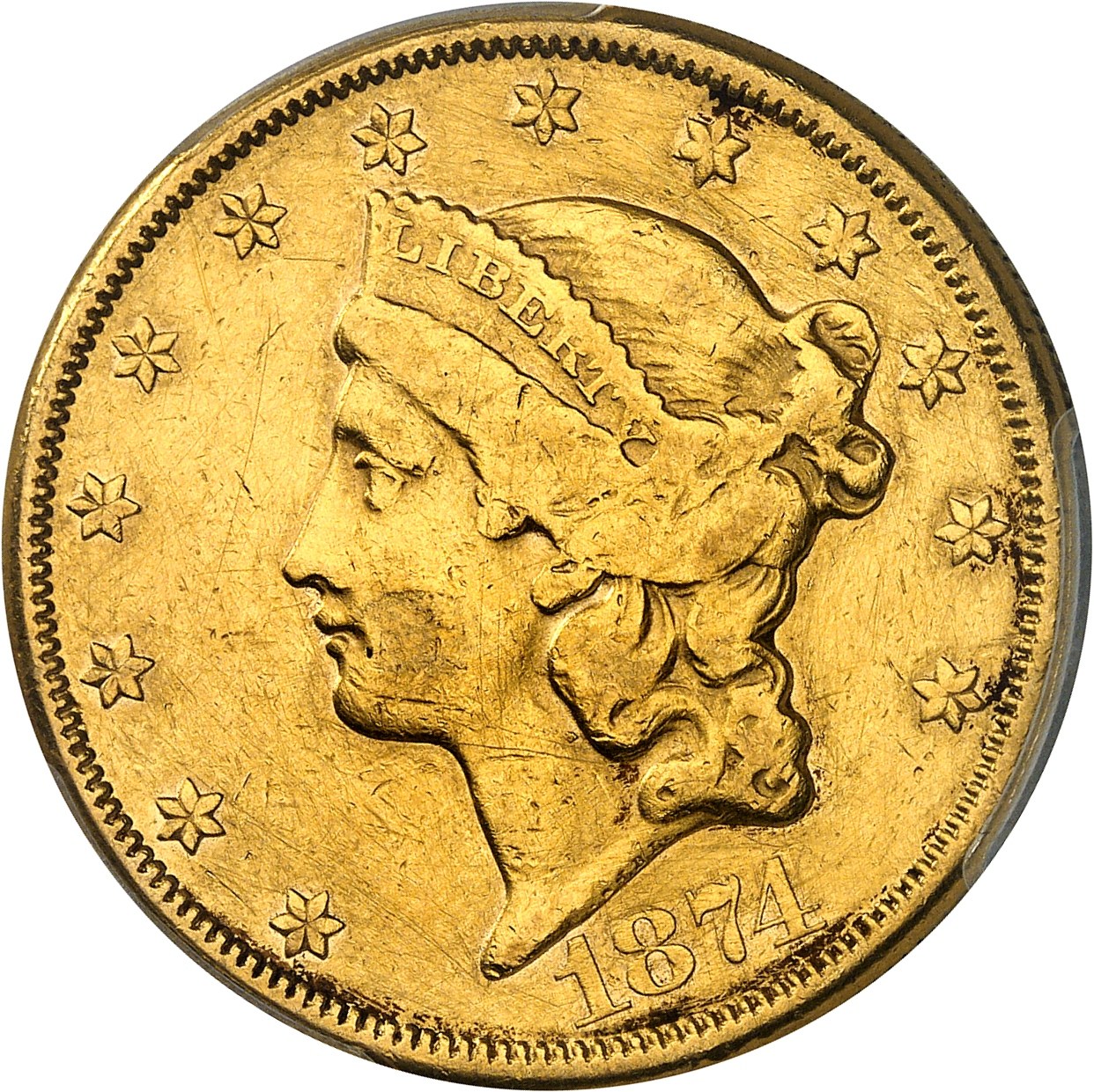 République fédérale des États-Unis d’Amérique (1776-à nos jours). 20 dollars Liberty, avec devise 1874, CC, Carson City. PCGS Genuine Harshly cleaned-XF Detail (38461587).