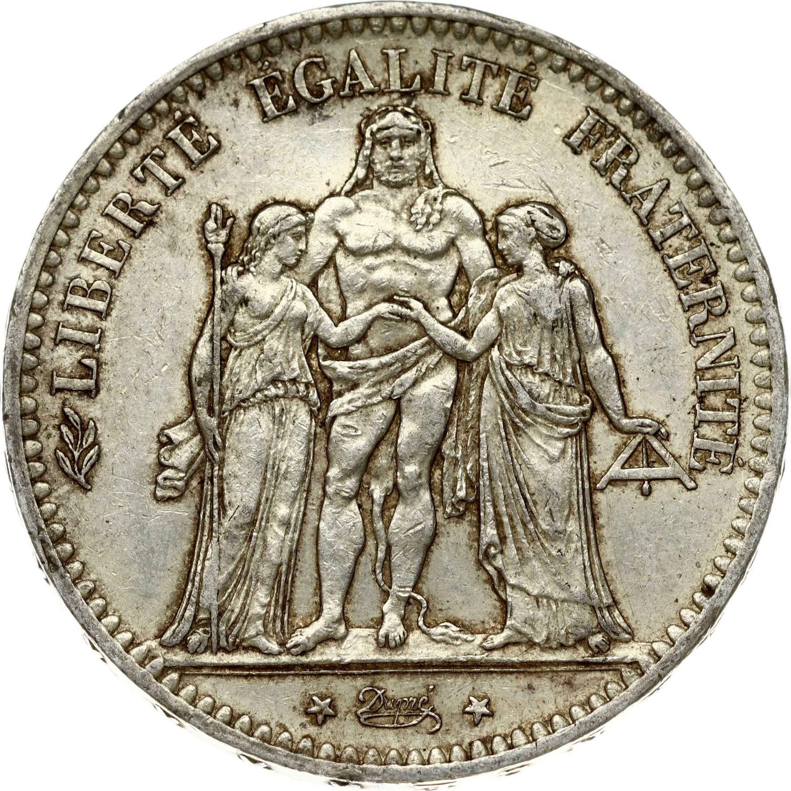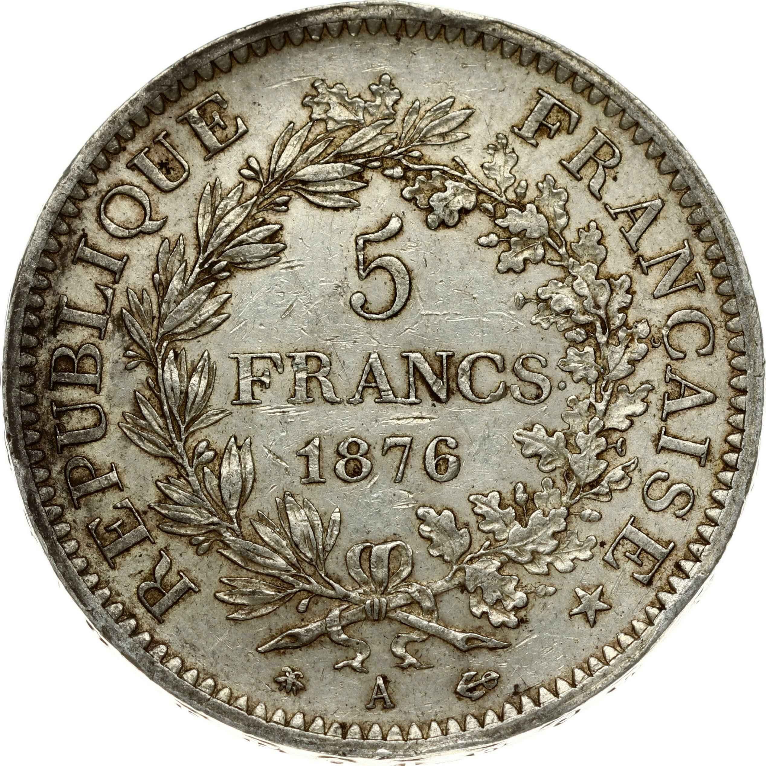 France 5 Francs 1876A Obverse: Hercules group. Reverse: Denomination within wreath. Silver. Small Scratches. KM 820.1