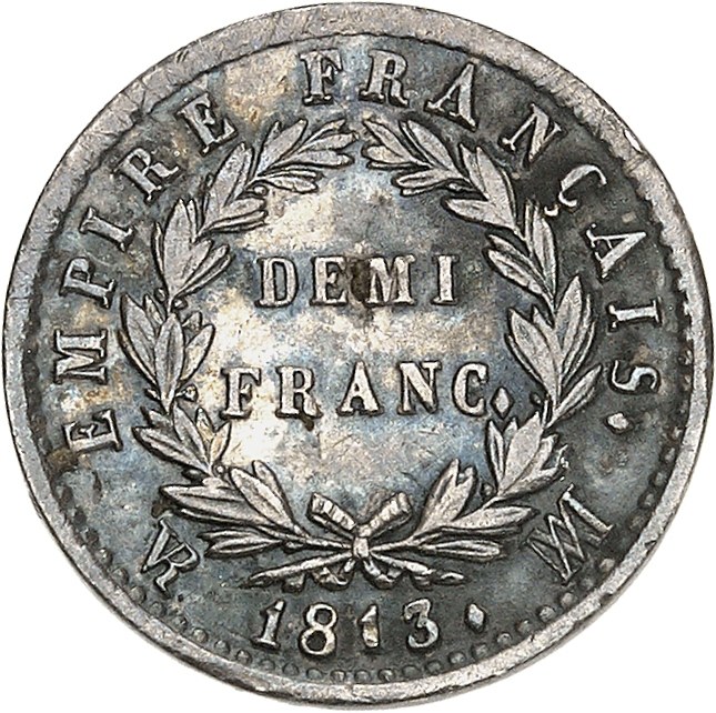 Rv. EMPIRE FRANÇAIS. Dans une couronne formée de deux branches : DEMI FRANC, au-dessous (différent) (date). (atelier).