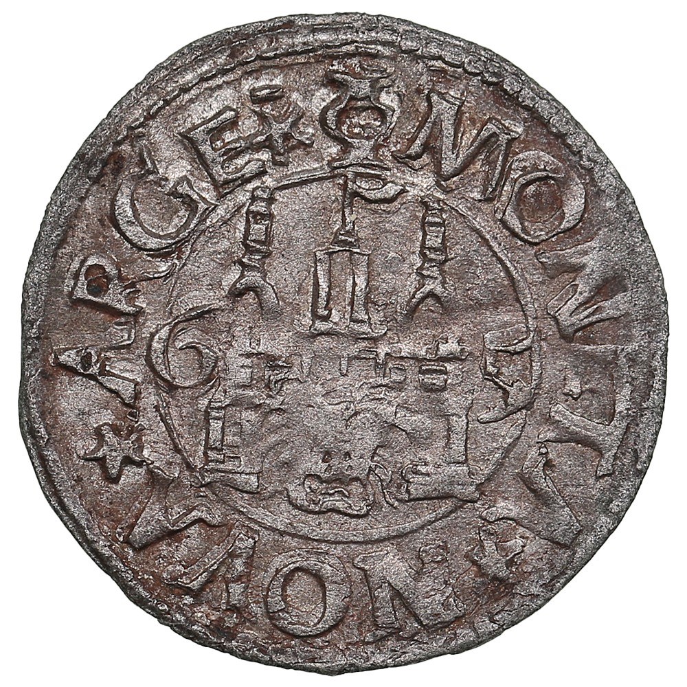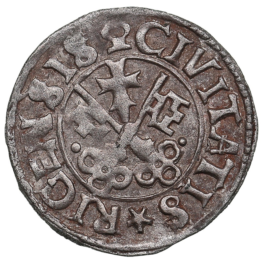 0.99g. AU/XF-. Obv.: Castle divides date (15)6-5; “Ф MONETA*NOVA*ARGE*”. Rev.: Coat of arms of Riga, dots in field; “Ф CIVITATIS*RIGENSIS”. Haljak 914. Issue historically associated with present-day Latvia and Poland.