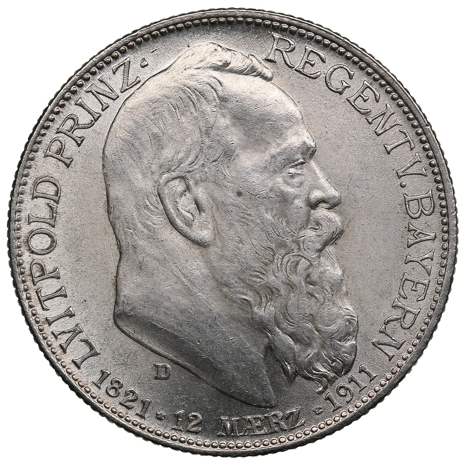 Bright mint luster. Mintmark D. Circulating commemorative coin: 90th birthday of Prince Regent Luitpold (1886-1912).