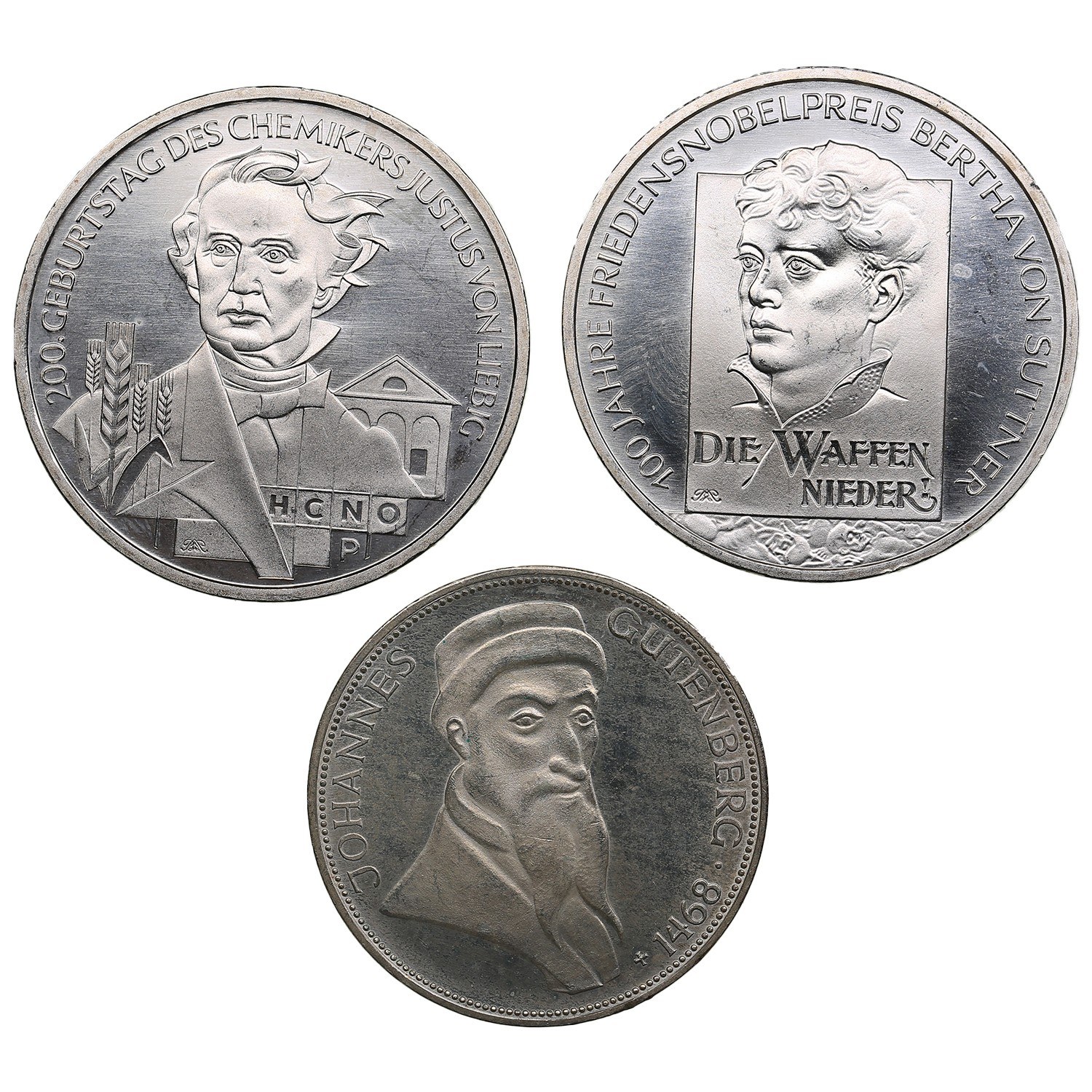 UNC-PROOF. Commemorative coins: 500th anniversary of the death of Johannes Gutenberg. Karlsruhe mint. KM 122; 200th anniversary of the birth of Justus von Liebig. Hamburg mint. KM 222; 100th anniversary of Bertha von Suttner Nobel Peace prize. Stuttgart mint. KM 242.