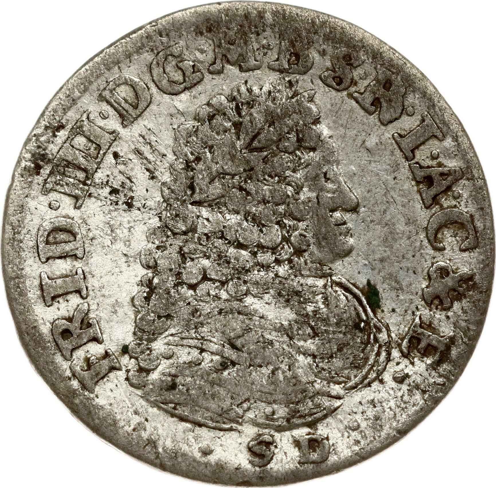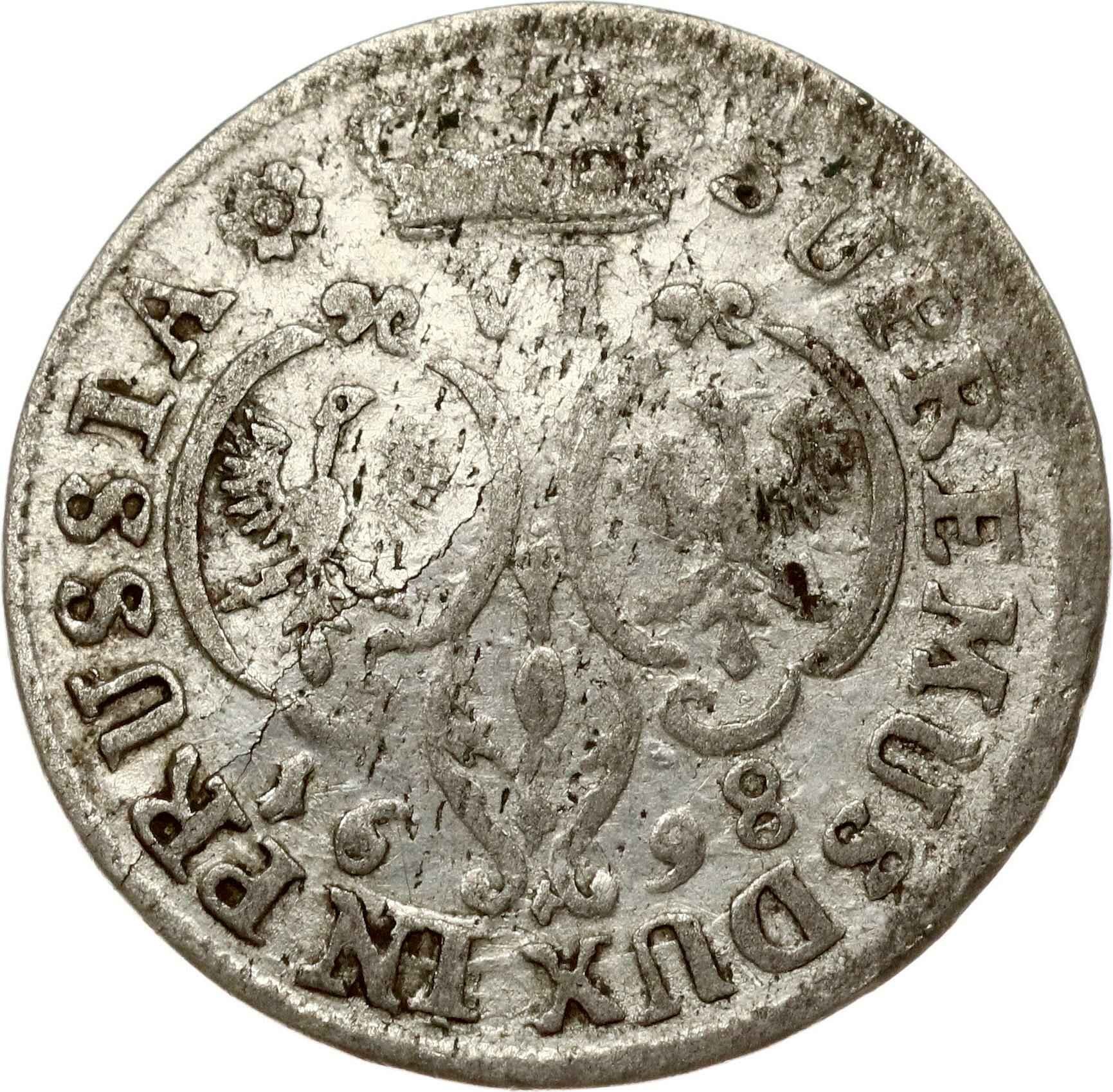Germany BRANDENBURG 6 Groscher 1698 SD Friedrich III (1688-1701). Obverse: Bust facing right. Lettering: FRID.III.D.G.M.B.S.R.I.A.C & E . SD. Reverse: Crown on top of denomination; to the sides two framed arms and in the center below a scepter. The date is seperated at the bottom by the scepter. Lettering: VI SUPREMUS DUX IN PRUSSIA 1698. Edge Smooth. Silver. Slight surface damage. KM 429