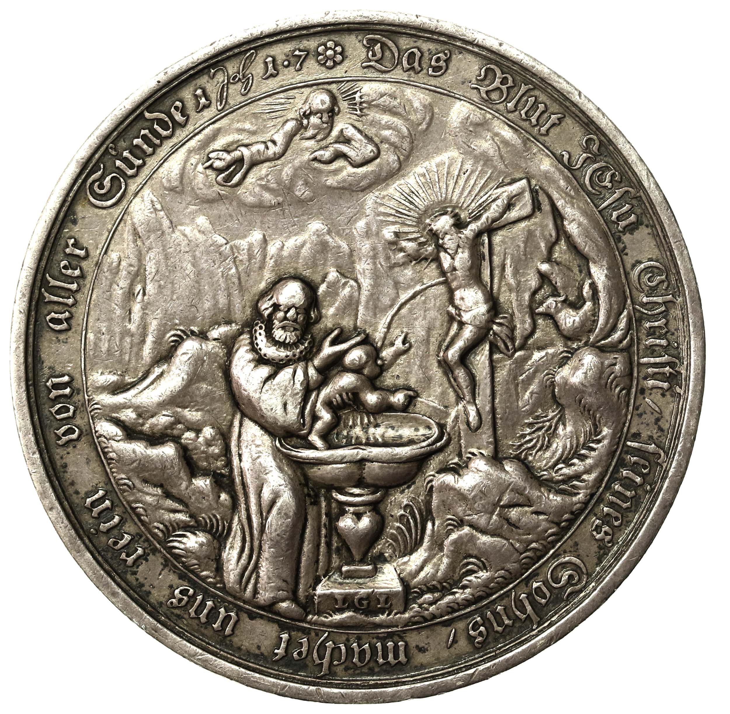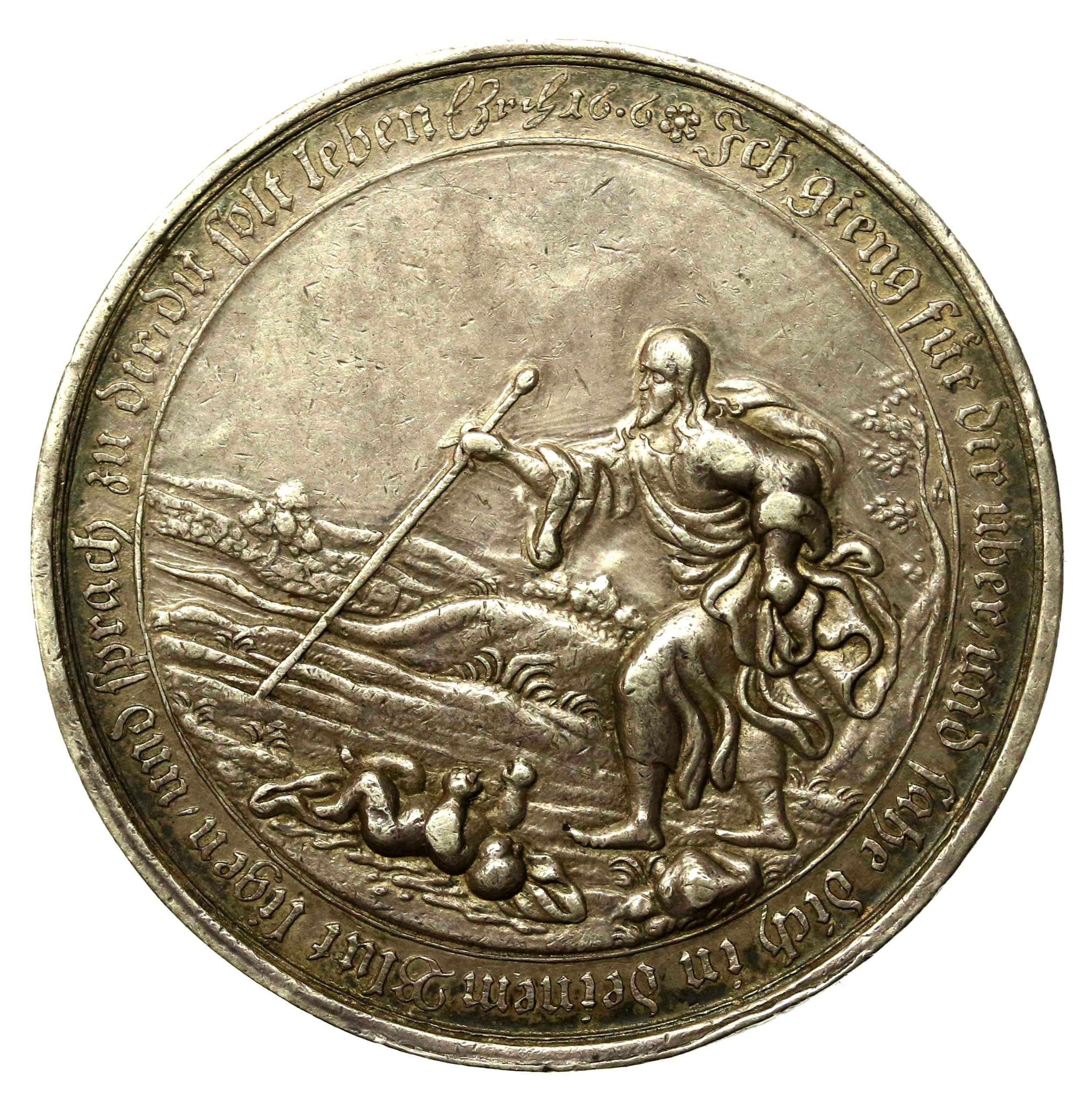 Medal religijny, miasto Norymberga, początek XVIII wieku. Stan zachowania 2. Dobrze zachowany medal w naturalnej patynie. Srebro, waga 72 grama.