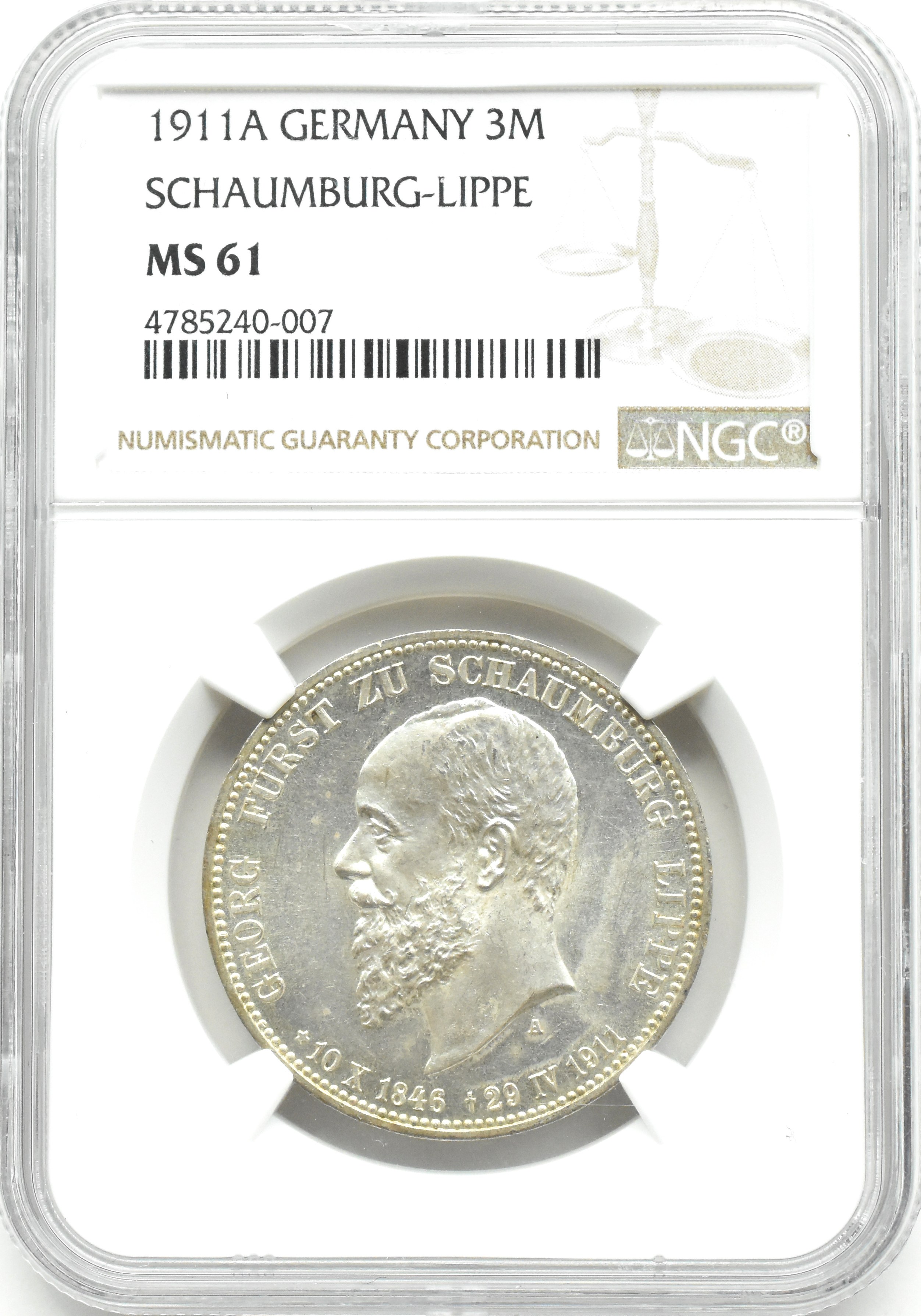 Niemcy, Schaumburg-Lippe, Georg, 3 marki 1911, mennica Berlin, NGC MS61