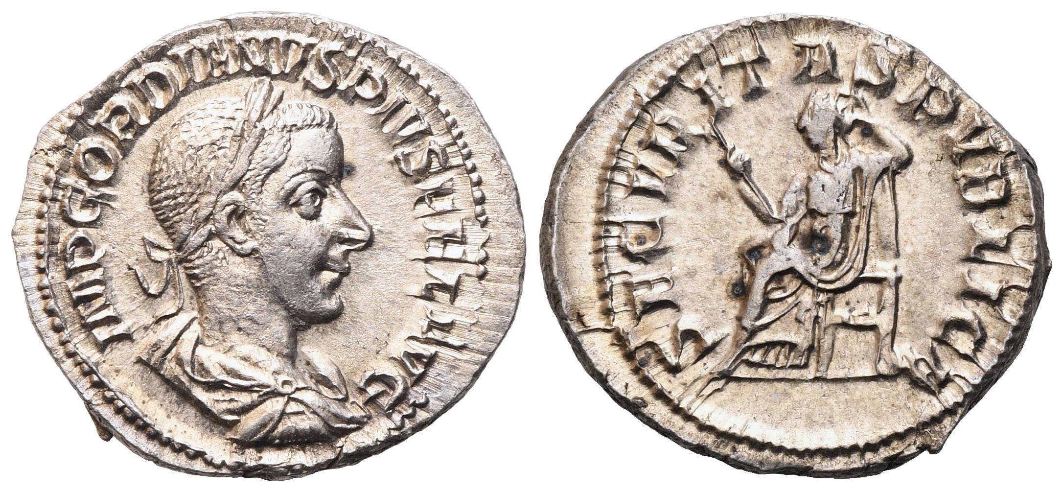 IMP GORDIANVS PIVS FEL AVG Laureate, draped and cuirassed bust of Gordian III to right. Rev. SECVRITAS PVBLICA Securitas seated left on throne, holding scepter and resting head upon hand. RIC 130. RSC 340. Extremely fine.