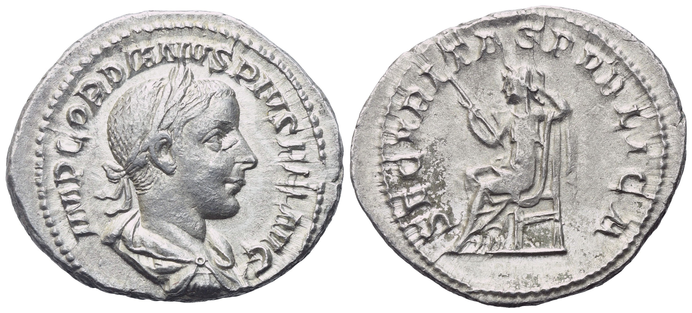 IMP GORDIANVS PIVS FEL AVG Laureate, draped and cuirassed bust of Gordian III to right. Rev. SECVRITAS PVBLICA Securitas seated left on throne, holding scepter and resting head upon hand. RIC 130. RSC 340. Extremely fine / near extremely fine.