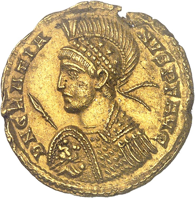 Av. D N GRATIA - NVS P F AVG. Buste cuirassé, avec casque à cimier orné d’étoiles, à gauche, tenant le bouclier orné d’un cavalier chargeant un ennemi de la main gauche et la lance de la main droite.