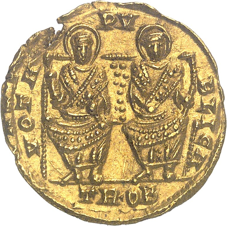 Rv. VOTA - PV - BLICA / TR. OB. Deux empereurs nimbés, assis de face sur un banc, tenant un sceptre et la mappa.