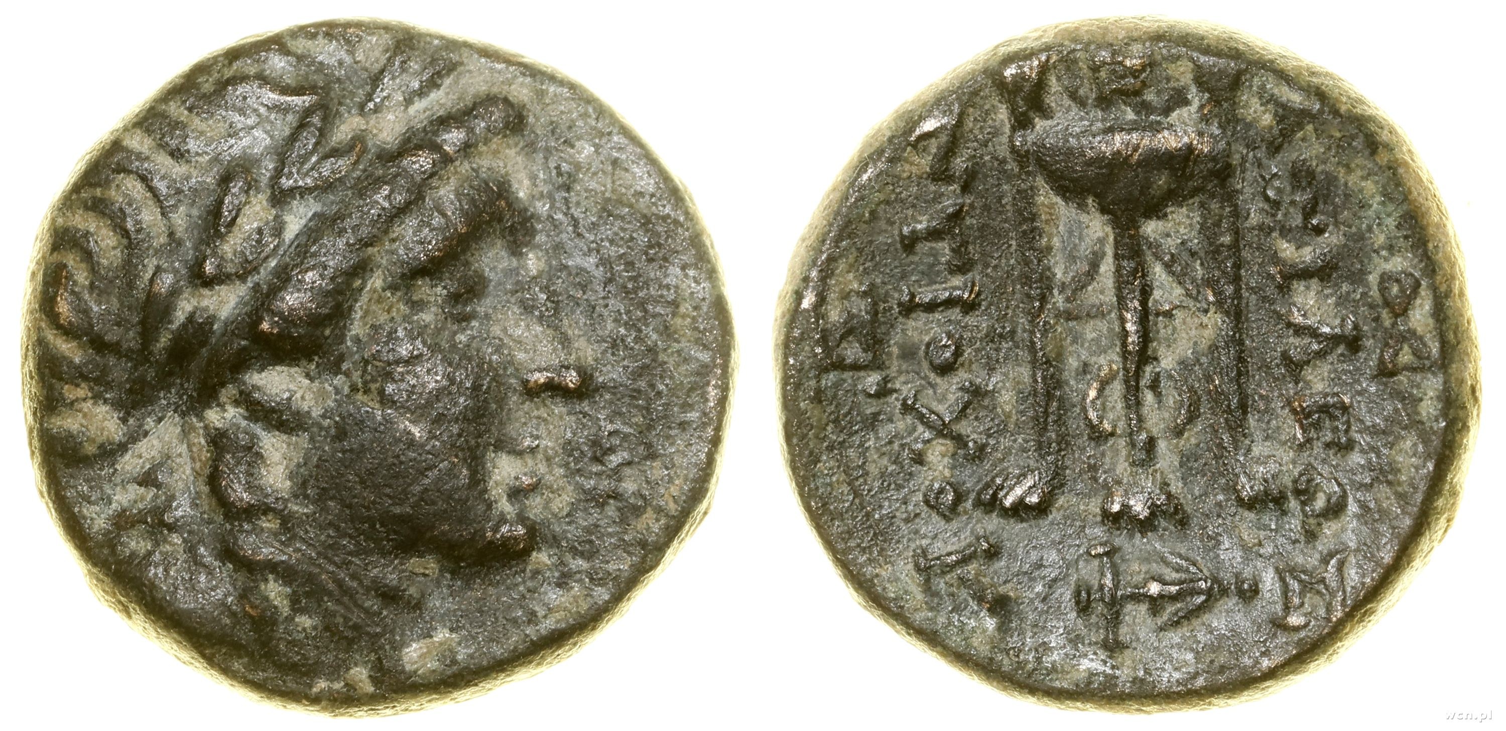 Aw: Głowa Apollina w prawo; Rw: Trójnóg, niżej kotwica w prawo, po bokach ΒΑΣΙΛΕΩΣ / ΑΝΤΙΟΧΟΥ oraz znaki mennicze