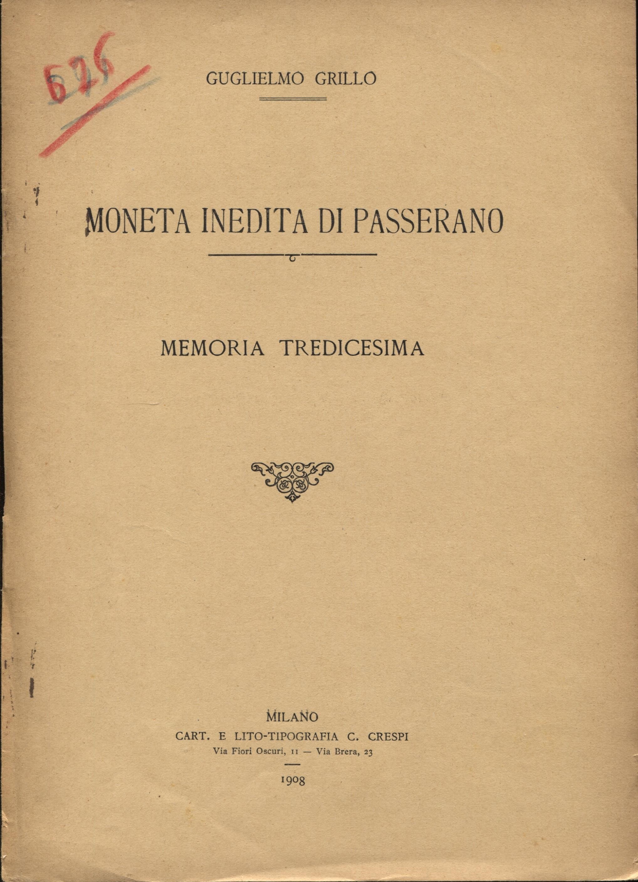 GRILLO G. - Moneta inedita di Passerano. Milano, 1908. pp. 3, con ill. nel testo. brossura ed. sciupata, interno buono stato,molto raro.