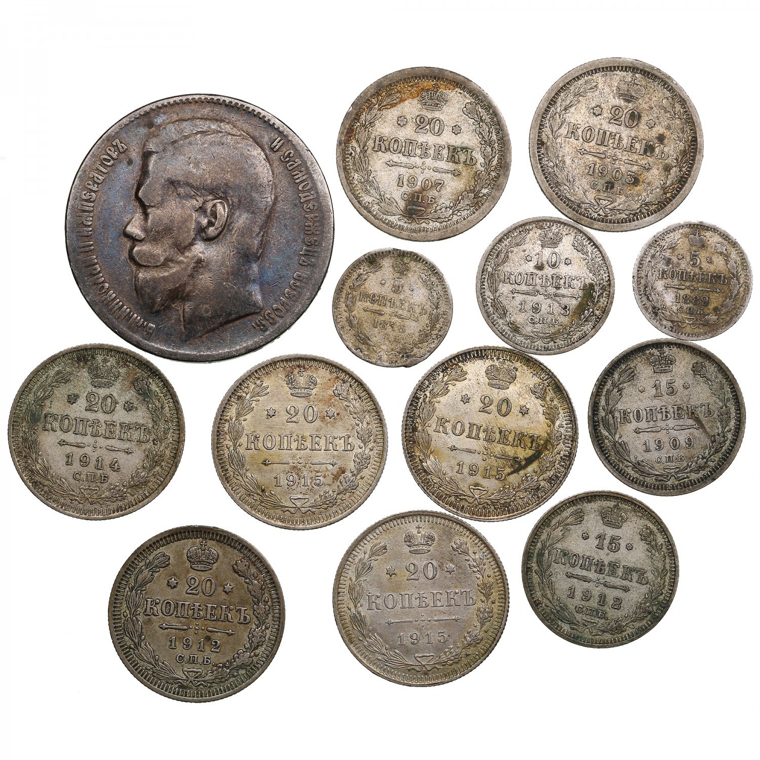 Various condition. Lot includes: Rouble 1897; 20 Kopecks 1903, 1907, 1912, 1914 1915 (3), 15 Kopecks 1909, 1912; 10 Kopecks 1913; 1876 R; 1889.