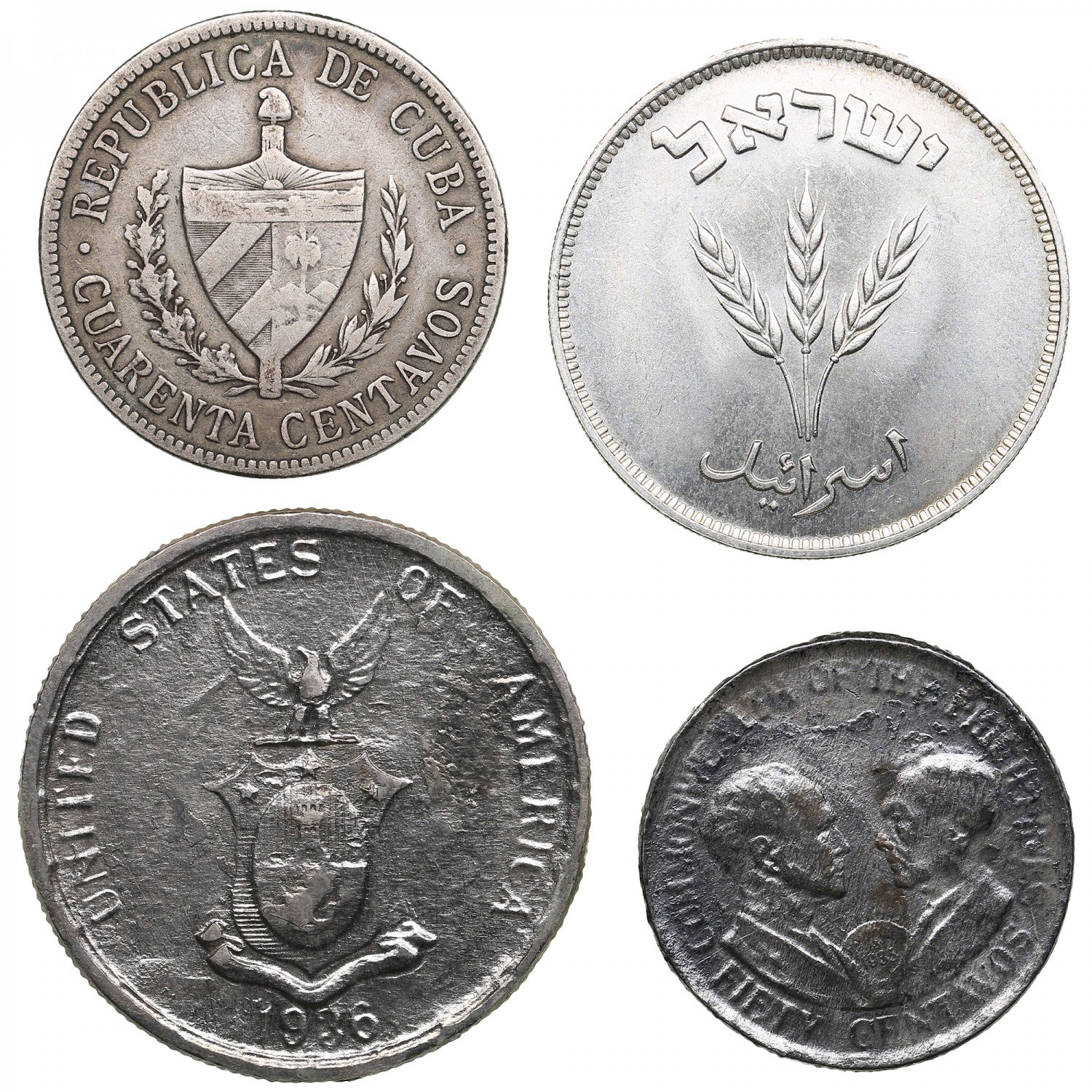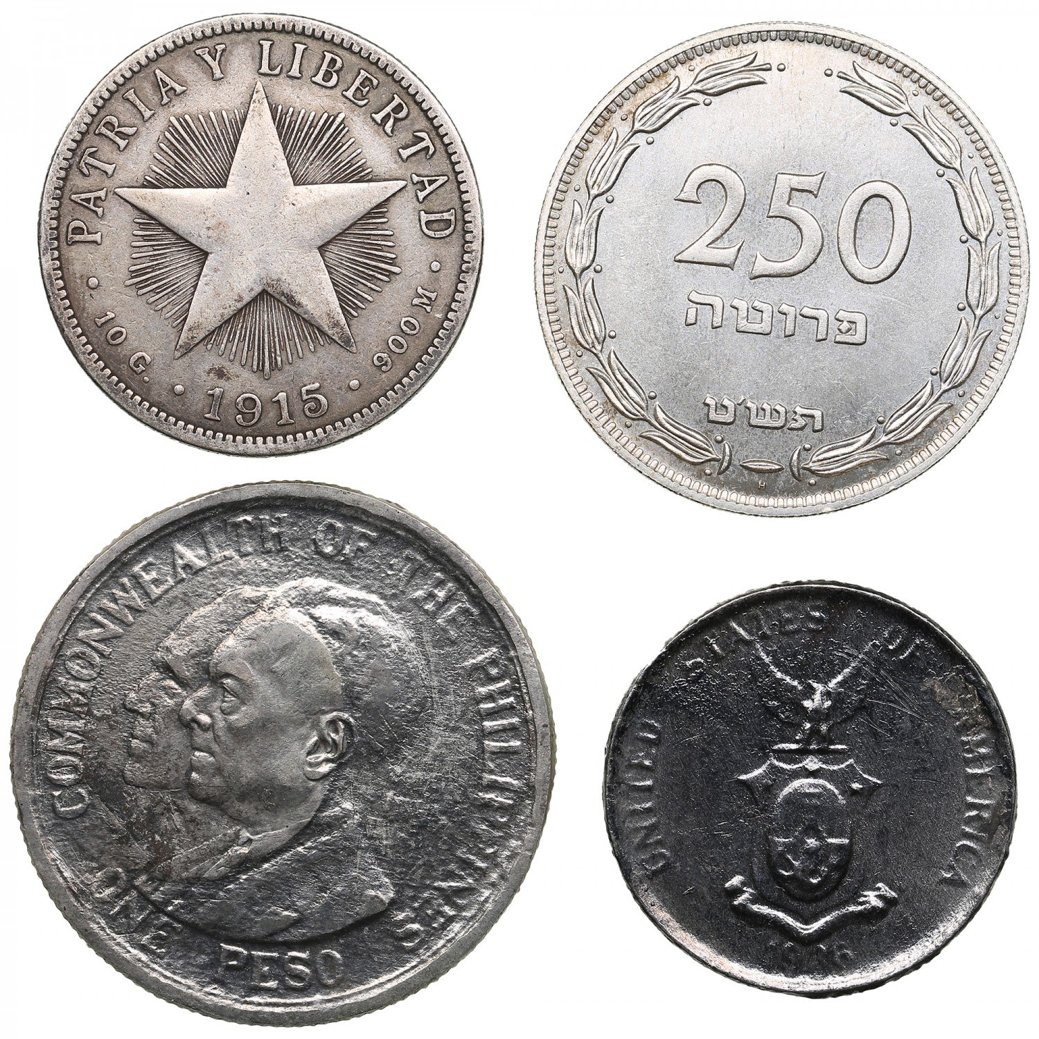 Various condition. Cuba 40 Centavos 1915. KM 14.3. Israel 250 Pruta 5709 / 1949. KM 15a. Philippines 50 Centavos, 1 Peso 1936. KM 176; 178. Establishment of the Commonwealth series.