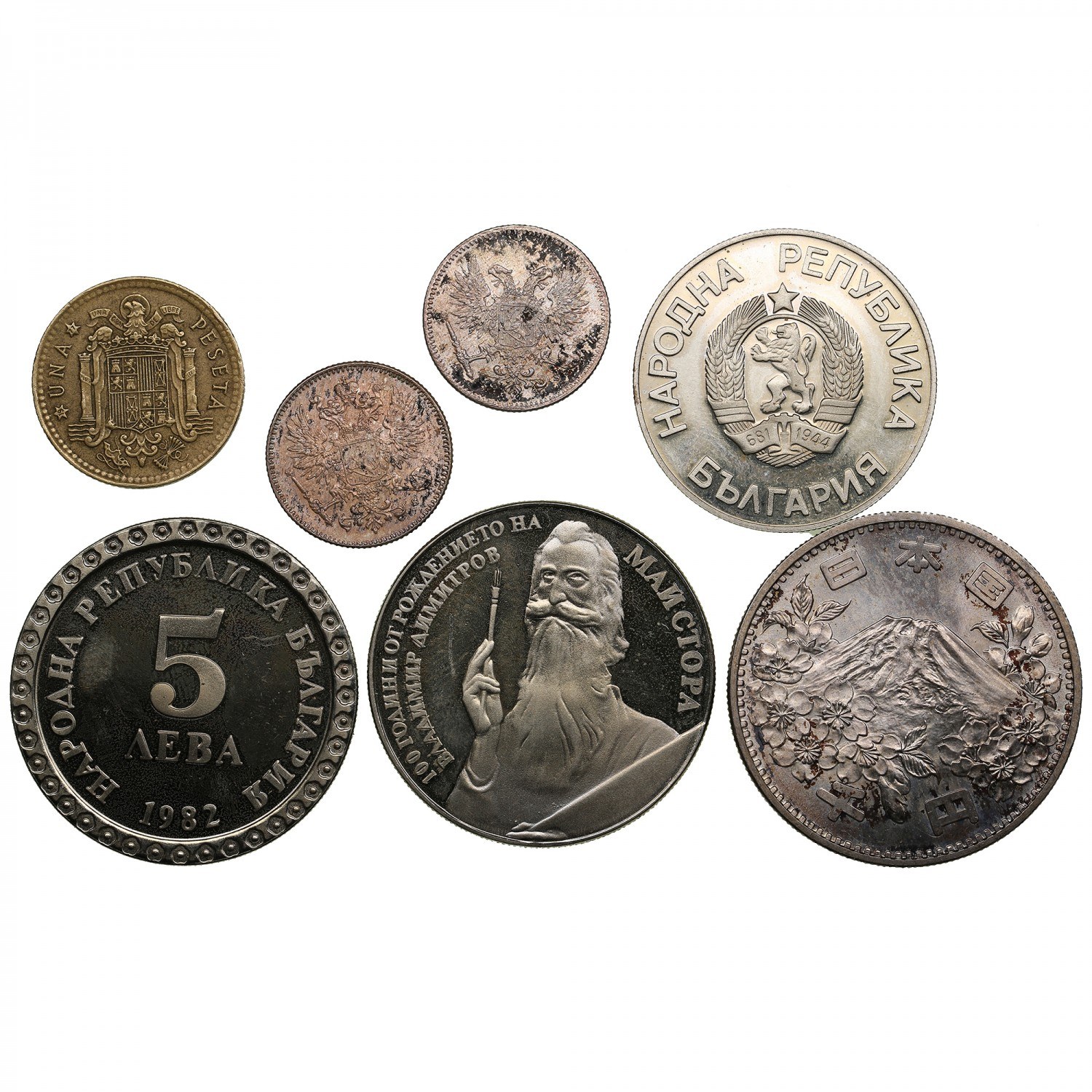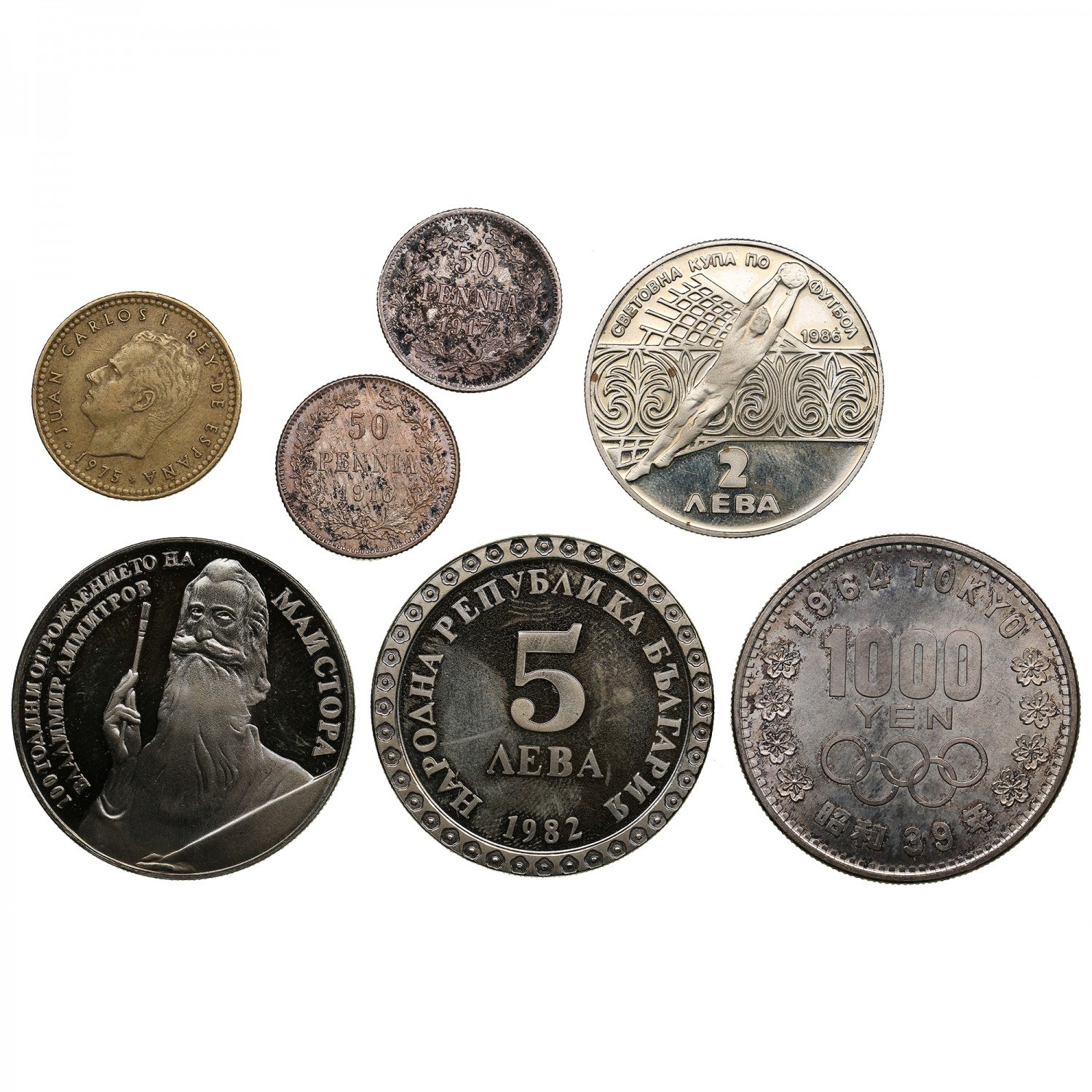 VF-PROOF. Finland Russia 50 Penniä 1916, 1917 Bulgaria 5 Leva 1982 - 100th anniversary of Vladimir Dimitrov’s birth, KM 140 (2); 2 Leva 1986 - World football championship, KM 155. Japan 1000 Yen 1964 - Tokyo Olympics. KM Y 80. Spain 1 Peseta 1975 - Juan Carlos I (1975-2014). KM 806.