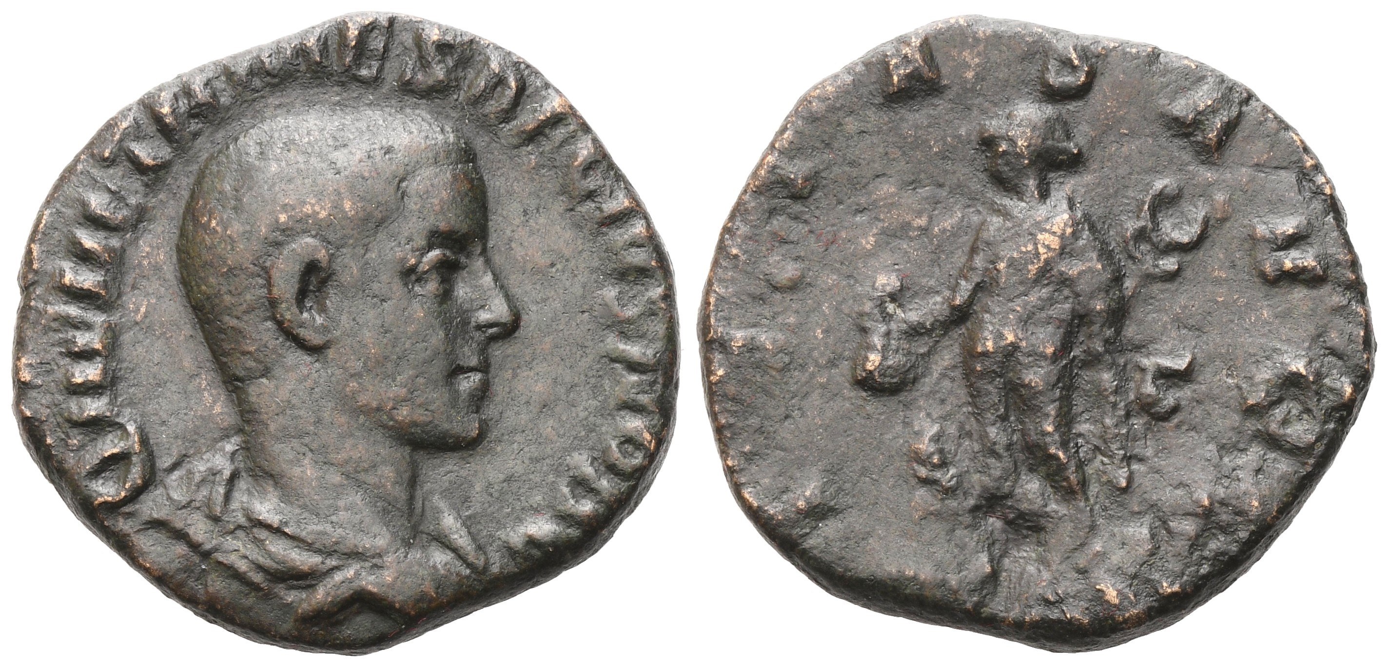 Q HER ETR MES DECIVS NOB C Bare-headed, draped bust r.; Rv. PIETAS AVGG / S - C Mercury standing l. holding purse and short caduceus. RIC 167a; Cohen 12. Dark brown patina. Very fine.