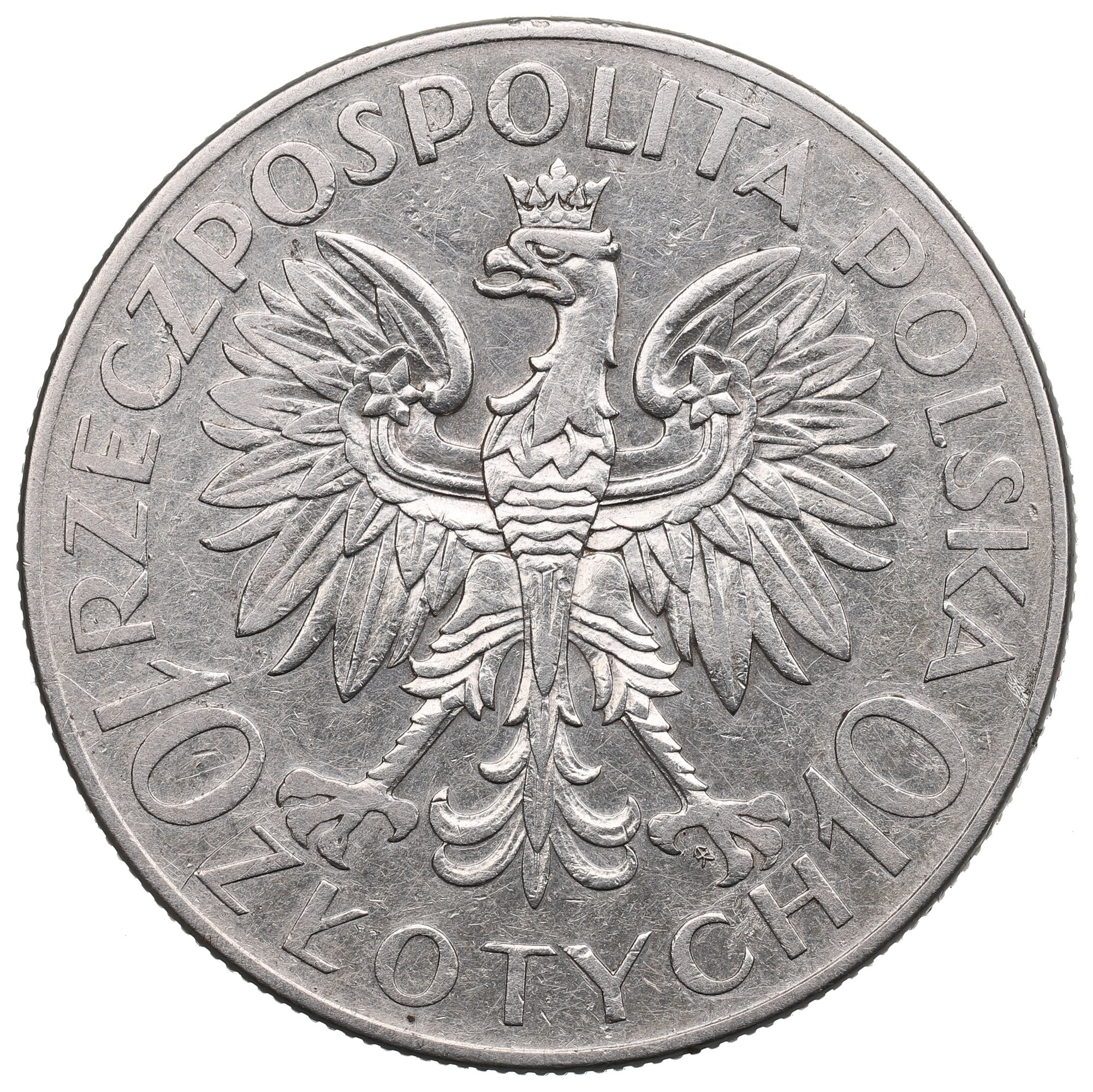 Awers: orzeł państwowy wzoru z 1927 roku, w otoku napis: RZECZPOSPOLITA POLSKA 10 ZŁOTYCH 10, pod łapą orła herb Kościesza – znak Mennicy Państwowej w Warszawie.