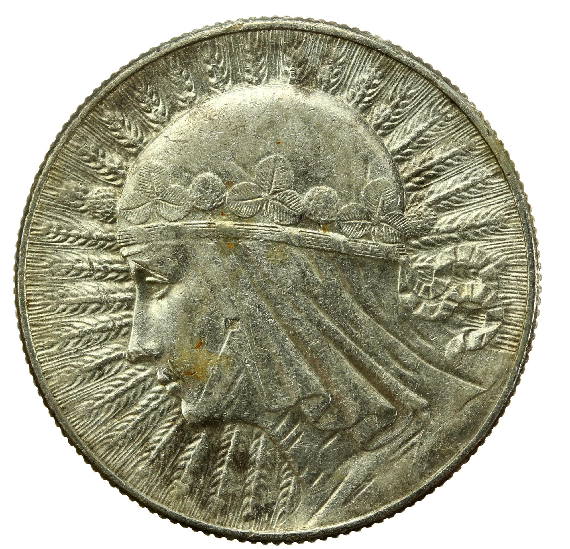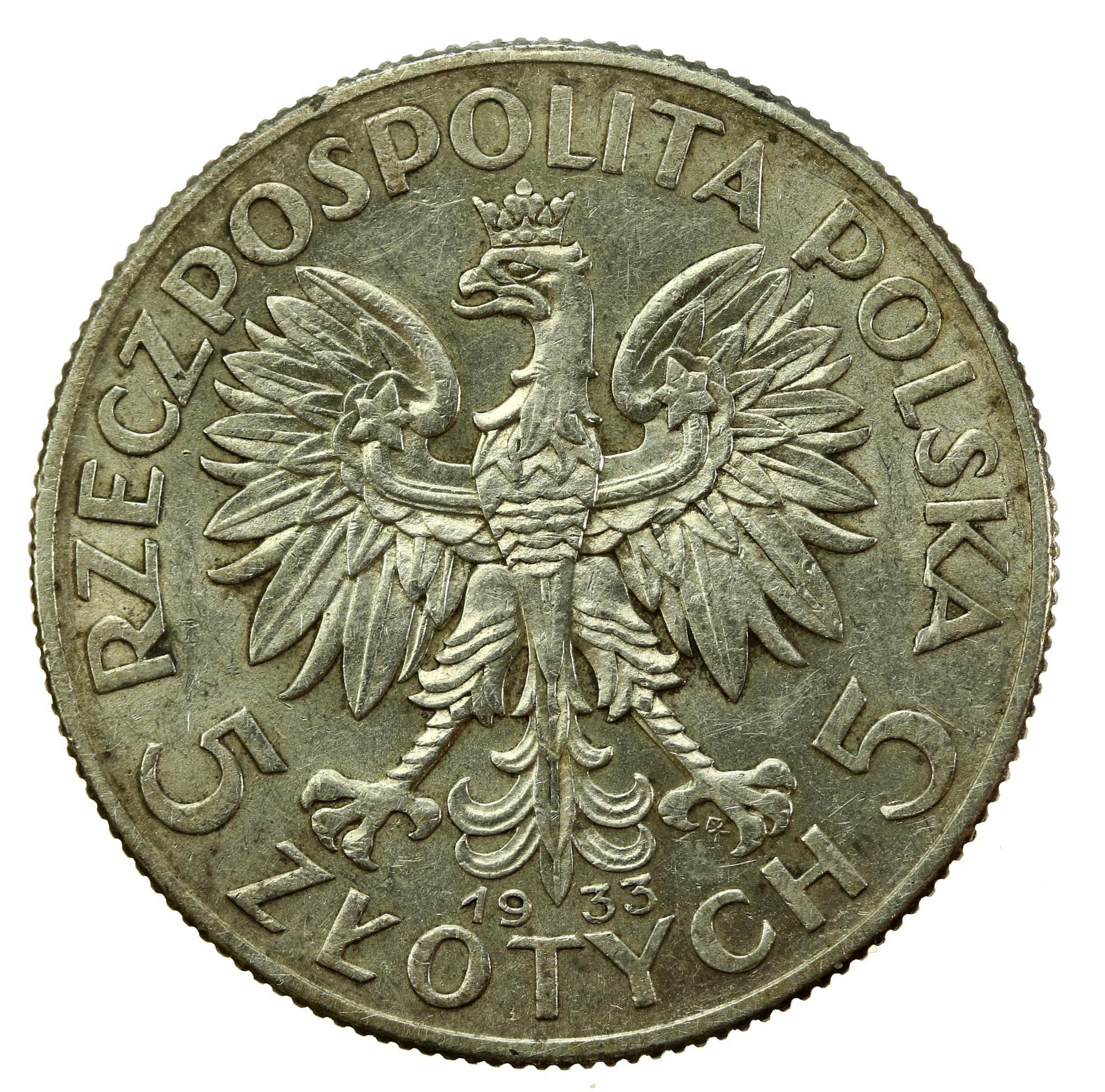 II RP, 5 złotych 1933, Głowa Kobiety. Piękny egzemplarz. Stan zachowania: 1-/2+. Nieobiegowy egzemplarz, lekkie mikroryski w tle. Ostry i robiący wrażenie połysk menniczy. Literatura: Parchimowicz 116c
