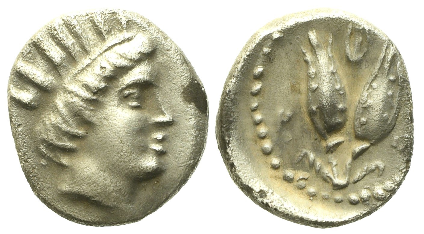 Radiate head of Helios r.; Rv. P - O. Two rose buds. Control: lyre. Karl coll. 533; SNG Keckman 617. Good VF