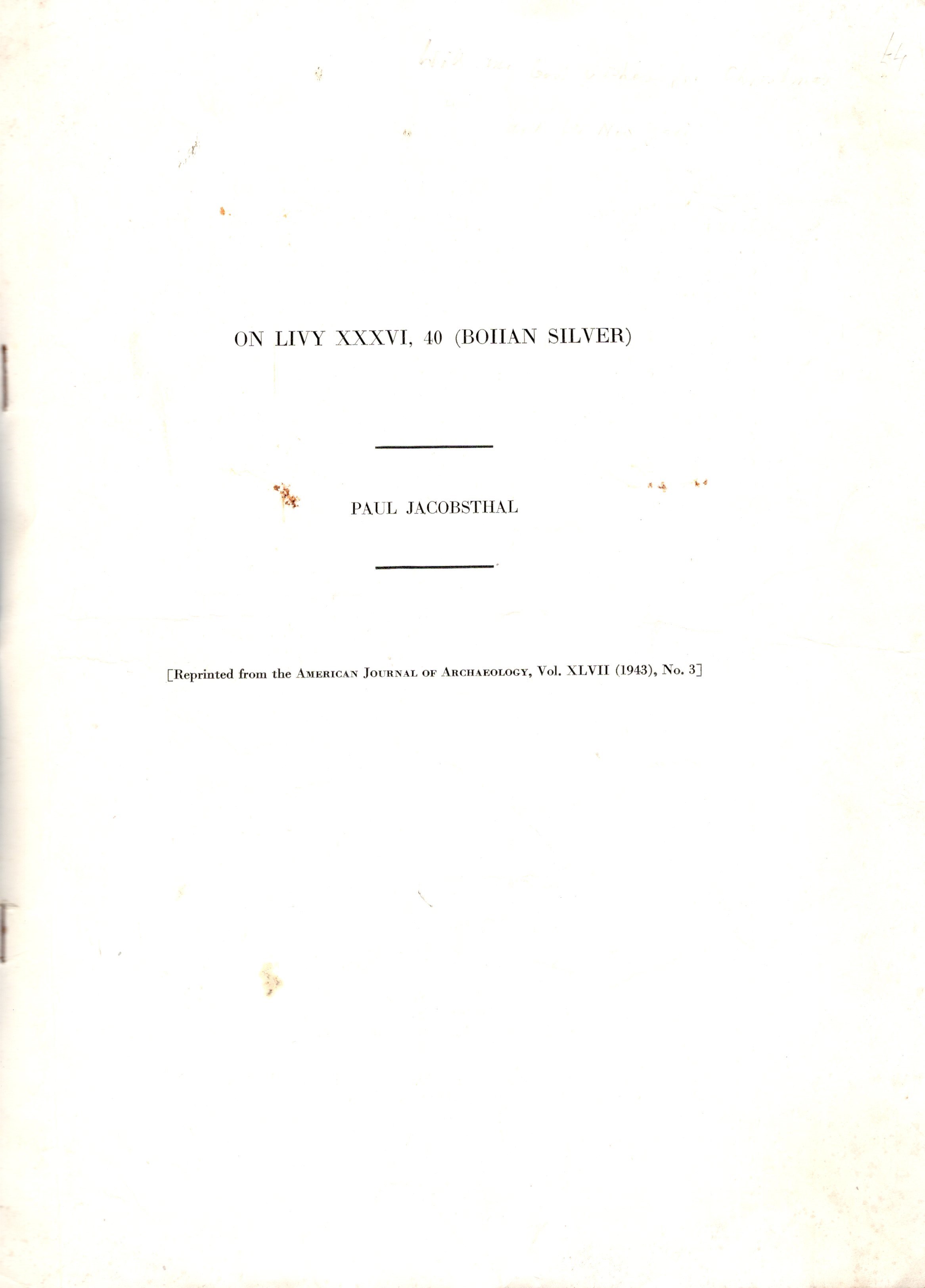 JACOSTHAL Paul - On liyi XXXVI, 40 ( Boian silver). New York, 1943. pp 306 -312, illustrazioni nel testo. brossura ed. buono stato, raro.