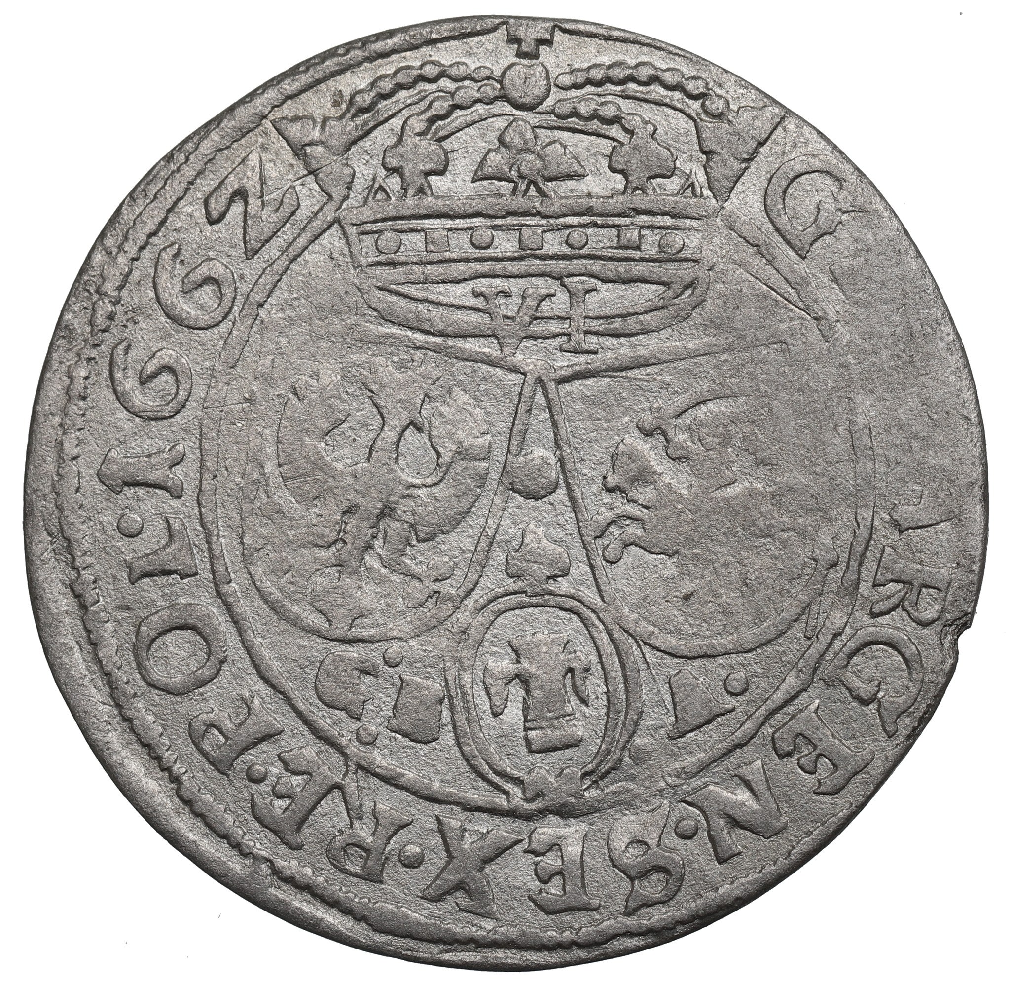 Awers: popiersie królewskie w zbroi, z wystającym koronkowym kołnierzem, z płaszczem, z Orderem Złotego Runa, w otoku legenda przedzielona herbem Ślepowron: