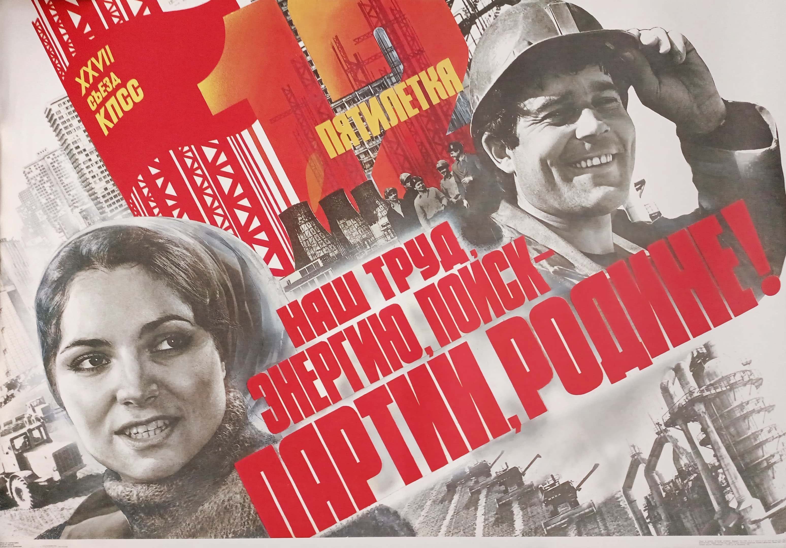 Radziecki plakat propagandowy, przedstawiający modelowych obywateli radzieckich na tle osiągnięć socjalizmu (budownictwo, przemysł, rolnictwo...), z napisem: "Nasza praca, nasza energia, nasze poszukiwania - dla partii, dla ojczyzny!".