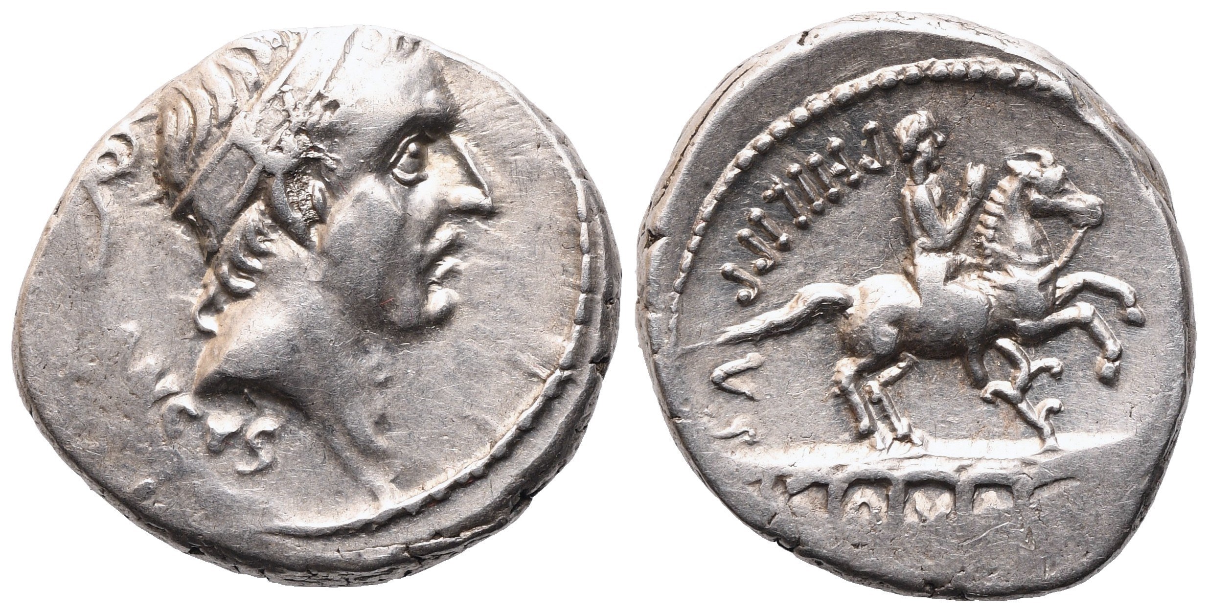 Diademed head of Ancus Marcius to r.; behind, lituus; below, ANCVS; Rv. Aqueduct, on which stands equestrian statue; at horse's feet, flower; on l. PHILIPPVS downwards; within arches of aqueduct, [AQUAMAR]. Crawford 425/1; Babelon (Marcia) 28; Sydenham 919. Good very fine / about extremely fine.