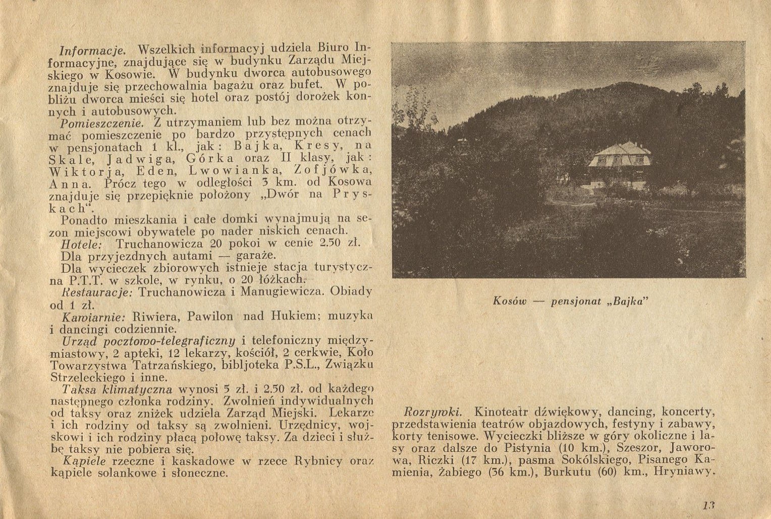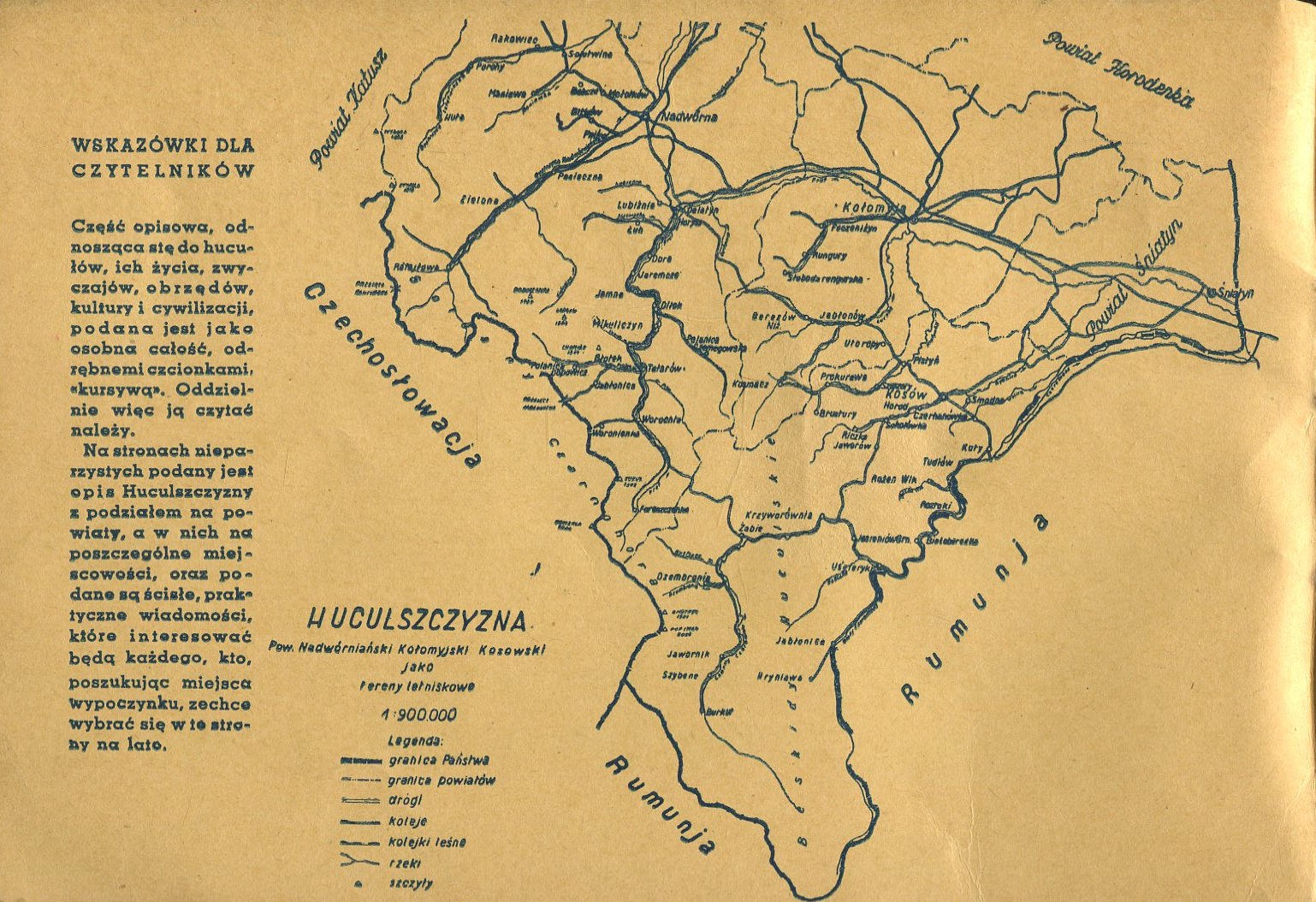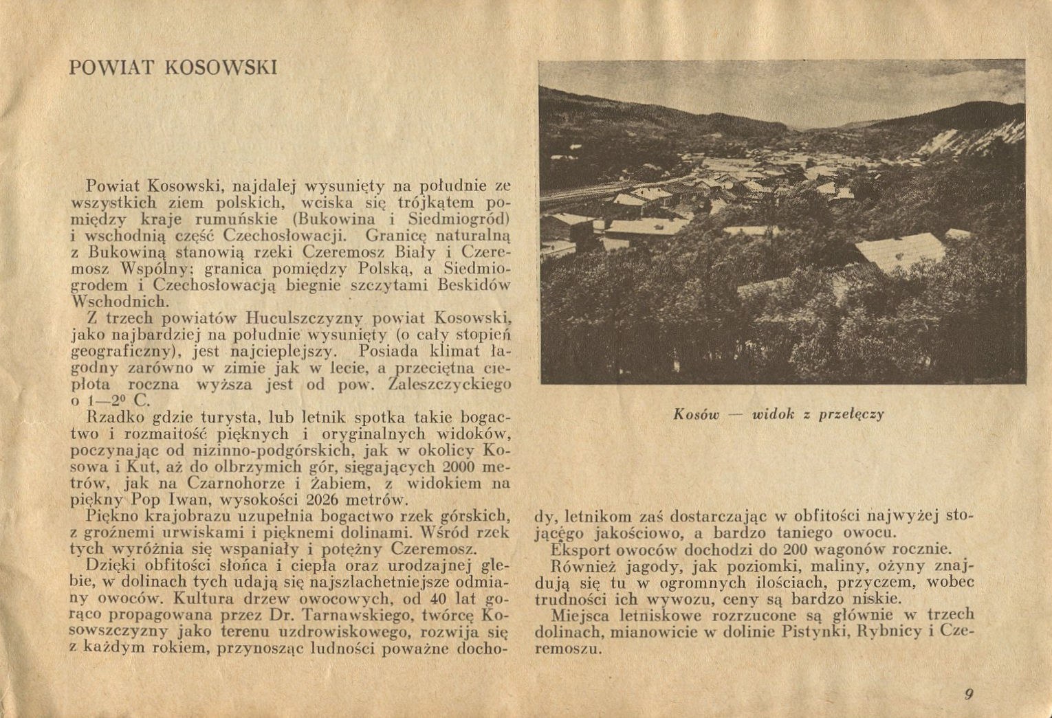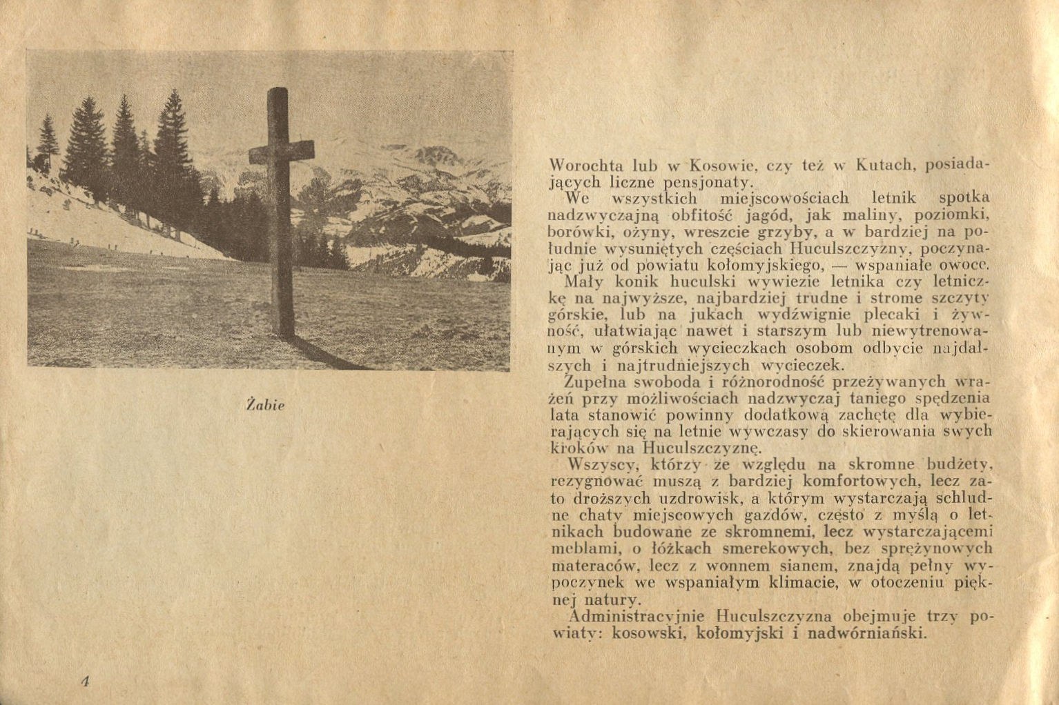 Folder reklamujący piękno Huculszczyzny. W treści m.in: Huculi, ich życie, obyczaje i wierzenia. Powiat Kosowski. Powiat Kołomyjski. Powiat Nadwórniański. Na zdjęciach: Żabie, Jawornik, Kosów.