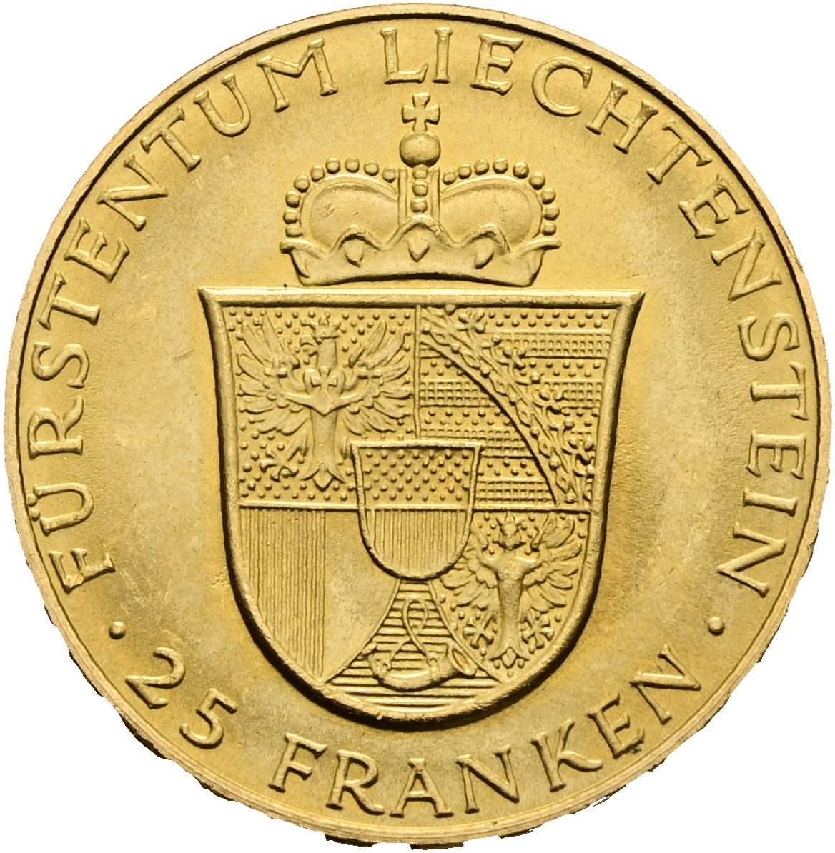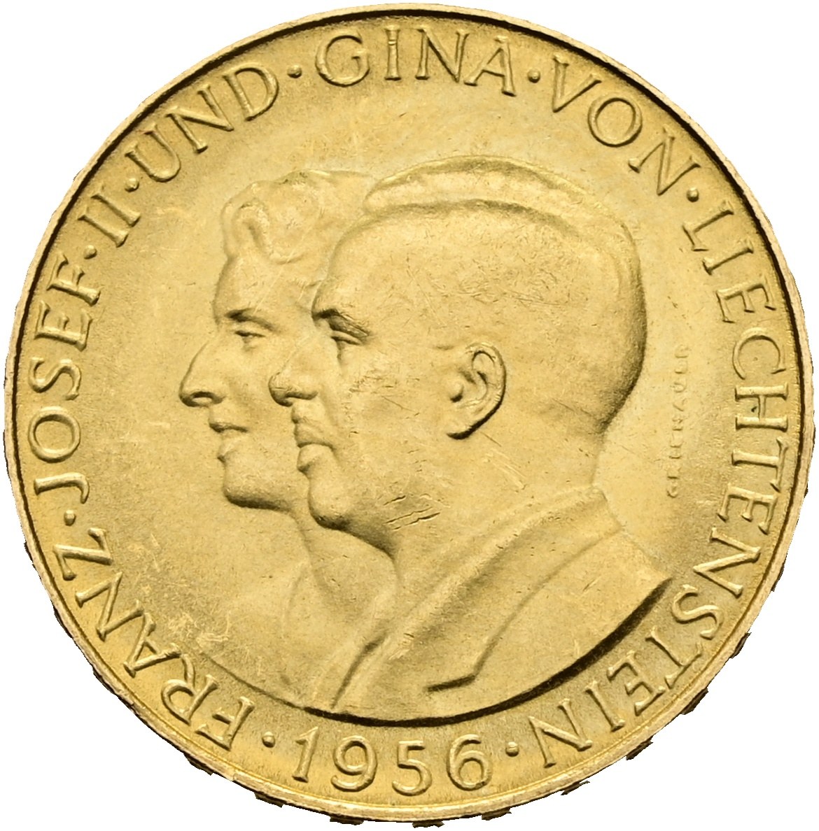 Goldmünze 25 Franken 1956. Fürstentum Liechtenstein. Geprägt in einer Auflage von lediglich 17'000 Exemplaren / Struck in a mintage of only 17,000 pieces.