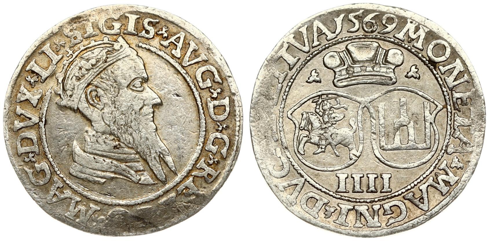 Lithuania 4 Groszy 1569 Vilnius. Averse: Crowned bust of Sigismund August of Poland to the right. Lettering: .SIGIS.AVG.D.G.REX.PO.MAG.DVX.LI. Reverse: Crowned double arms. Lettering: MONETA.MAGNI.DVCAT.LITVA 1569 IIII. Rare type and legend. Silver. Ivanauskas 10SA40-3. (R) RARE