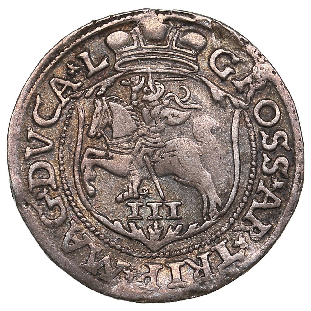 Rev.: Crowned coat of arms of Lithuania – ‘Pogonia’: knight on horseback left, brandishing sword; below, value III; “GROSS AR TRIP MAG DVCA L”.