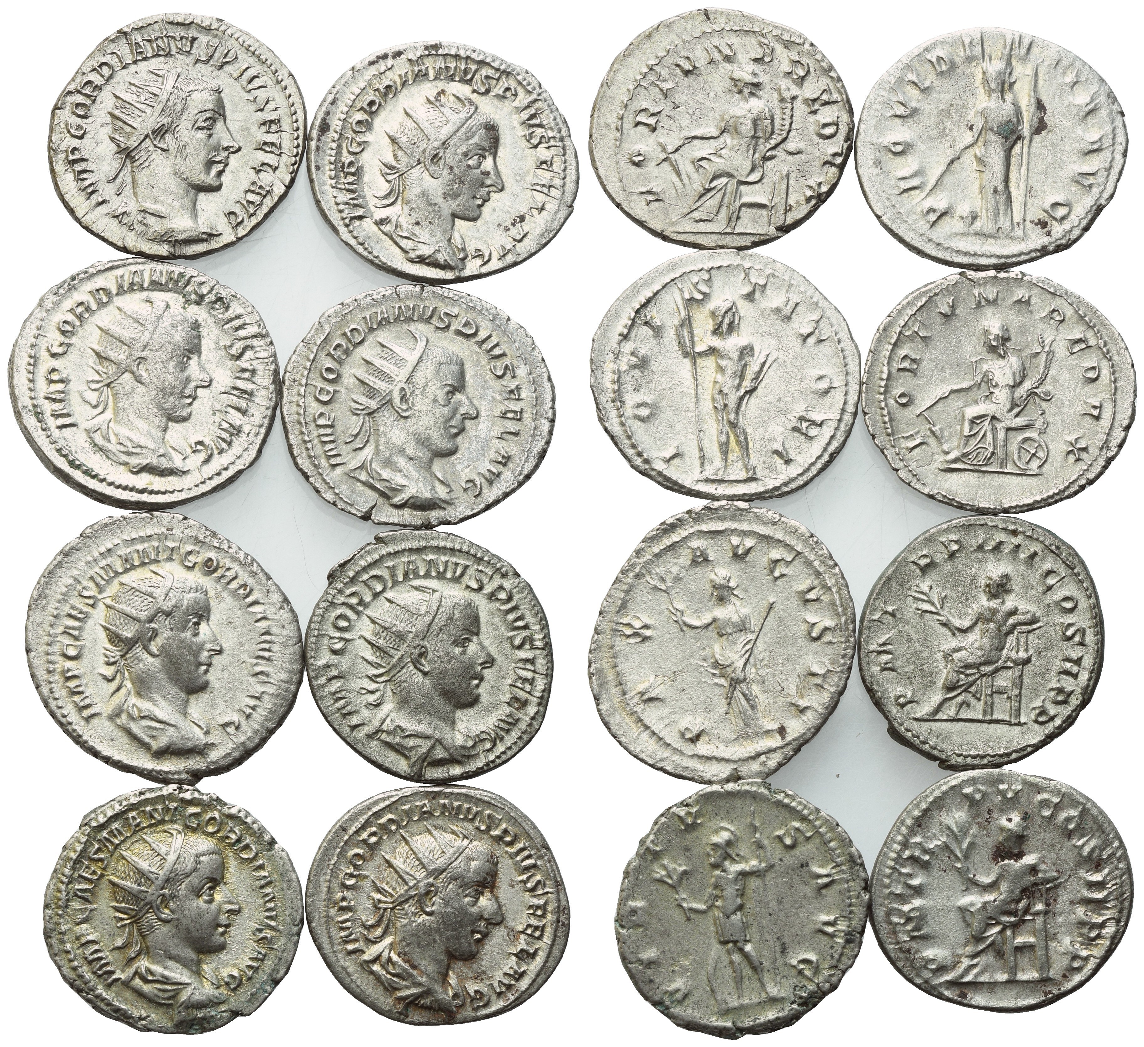 Lot of 8 Roman AR coins to be catalogued. Lot to be sold as is, no returns.