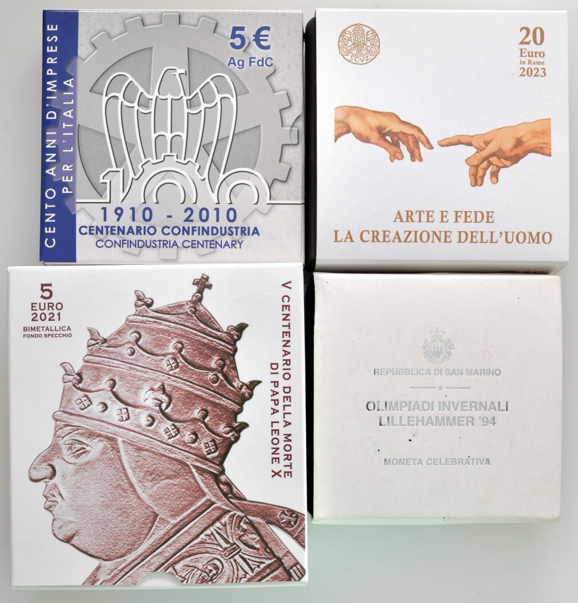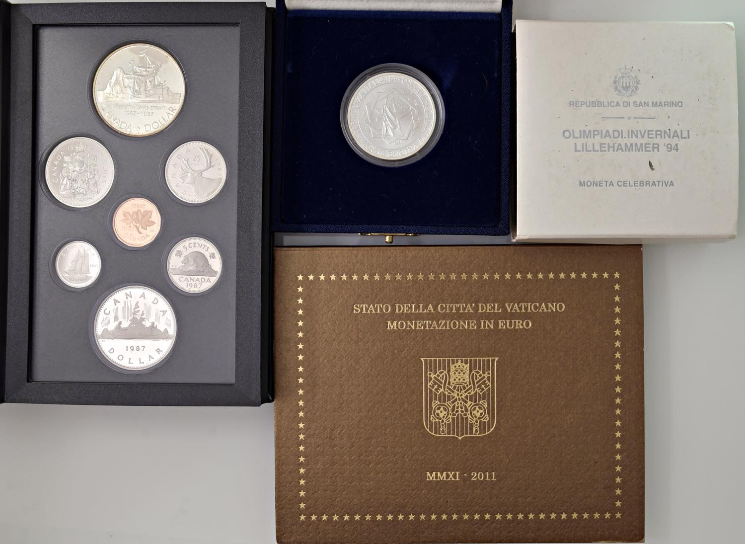 WORLD COINS Lotto composto da 2 cofanetti della Repubblica di San Marino, 7 cofanetti della Zecca di Stato italiana, 1 cofanetto dello Stato della città del Vaticano e 1 cofanetto del Canada, contenenti monete commemorative.