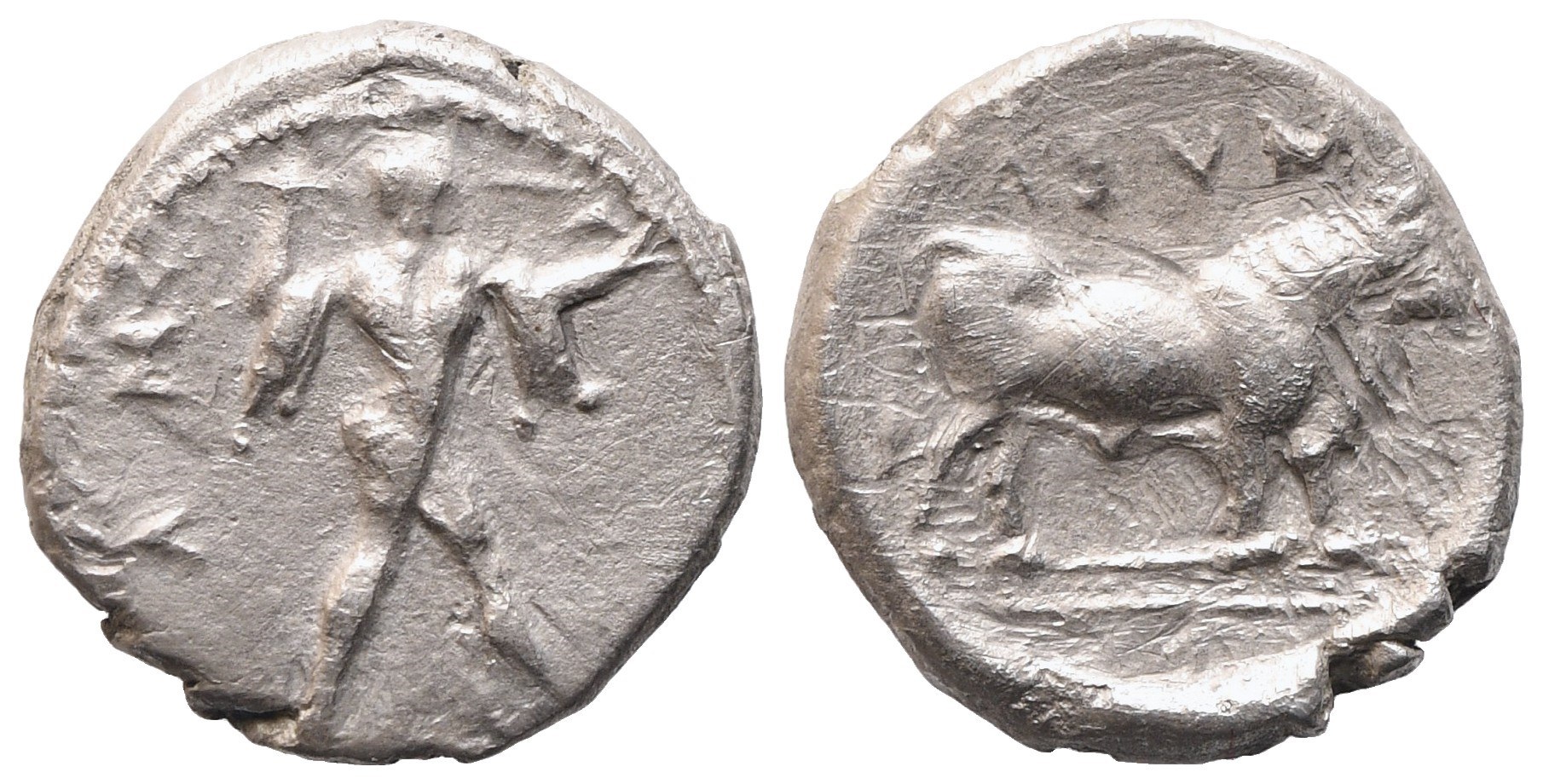 Poseidon walking r., wielding trident; Rv. Bull standing r. HNItaly 1119; SNG ANS 701. VF