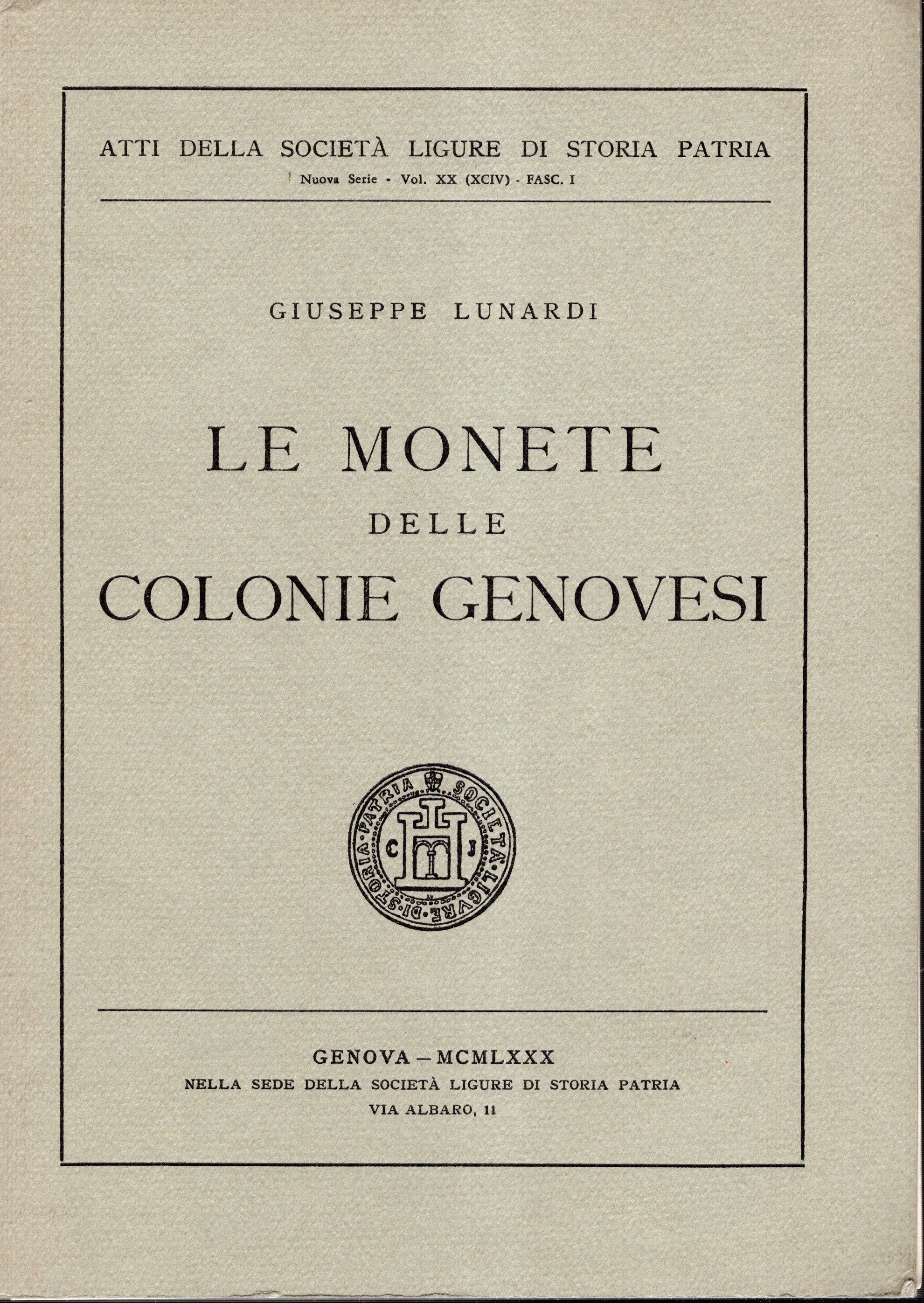 LUNARDI Giuseppe - Le monete delle colonie genovesi. Genova, 1980. pp. 317, tavv. e ill. nel testo. legatura ed. buono stato, importante opera di riferimento delle colonie genovesi.